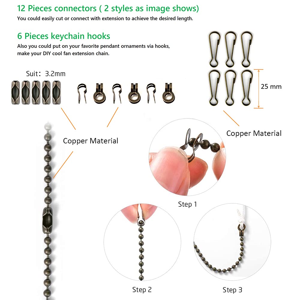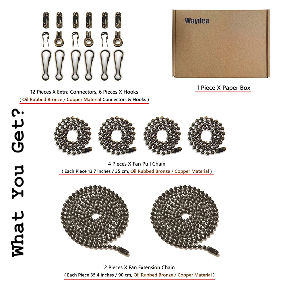 What You Get? 4 Pieces * 13.7 Inches (35 Cm) Bead Pull Chains 2 Pieces * 35.4 Inches (90 Cm) Bead Pull Chains 12 Pieces * Extra Connectors (2 Styles Just As Image Shows) 6 Pieces * Hooks Specification: Color: Oil Rubbed Bronze Chains, Oil Rubbed Bronze Connectors & Hooks Material:All Bronze / Brass Material Diameter Of Each Bead: 3.2Mm Style Of Connectors: Pull Loop And Beaded Notice: Our Guarantee, If You Are Not Satisfied For Any Reason, Just Return For A Refund Of Your Purchase Price, We Promise 24 Hours Customer Support, Please Feel Free To Contact Us For Any Product And Order Problem.