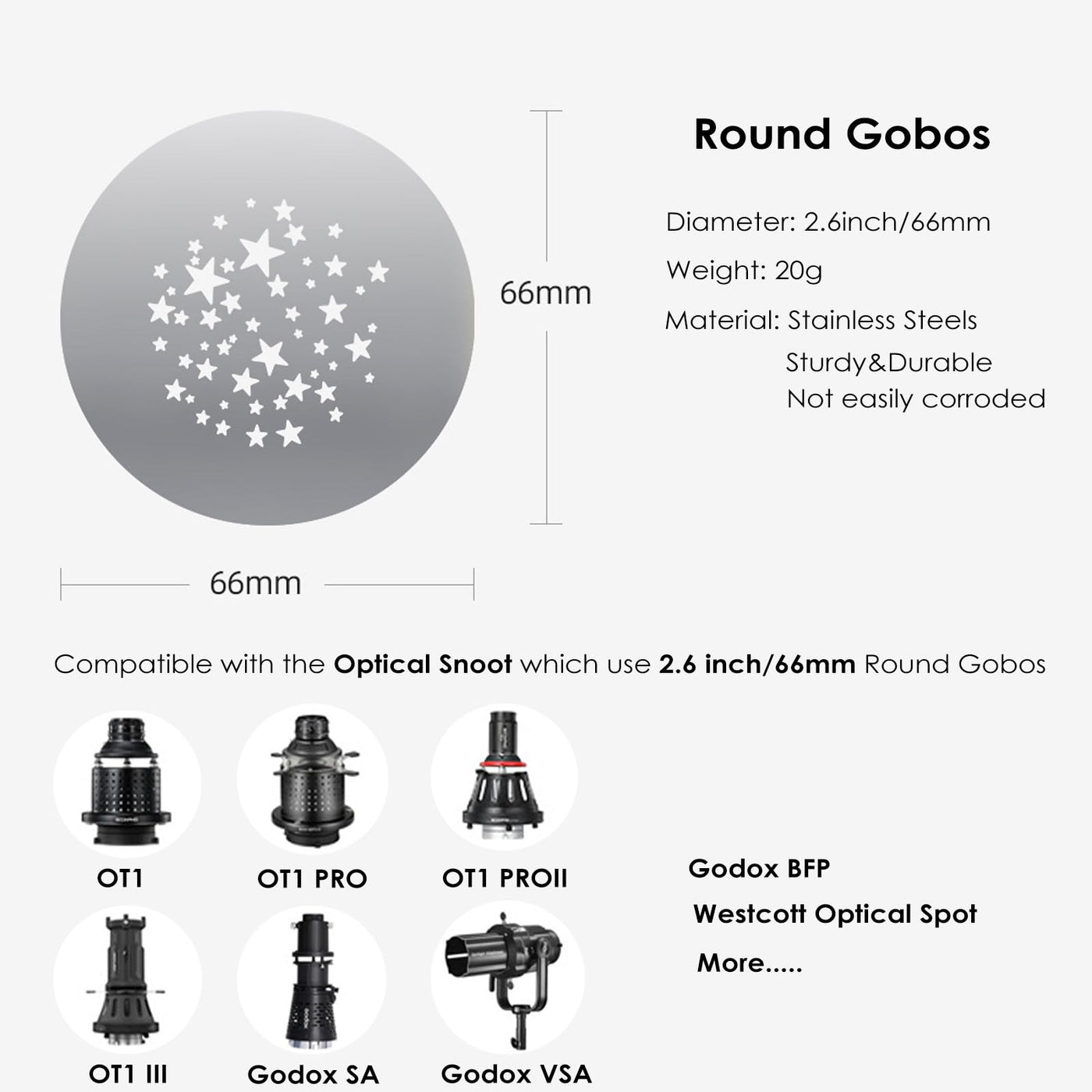 Q: Can I use gels with these gobos for creative lighting effects?A: Absolutely! The gobos can be combined with gels to create additional creative lighting options, enhancing your photography or videography projects.