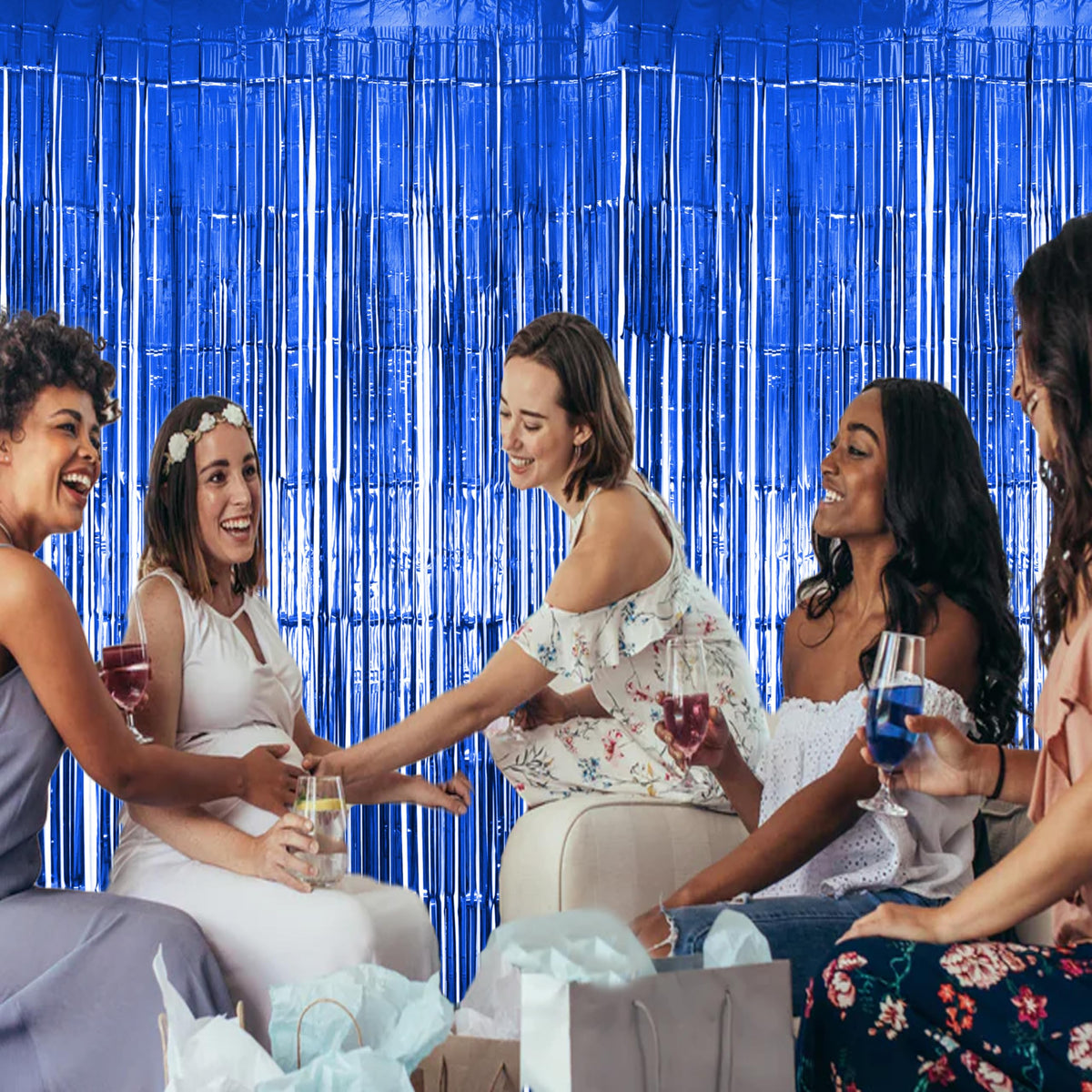 Q: What types of events are these blue streamers suitable for?A: These blue foil fringe curtains are perfect for a wide range of events, including birthday parties, baby showers, weddings, engagements, and holiday celebrations like Halloween and Christmas.
