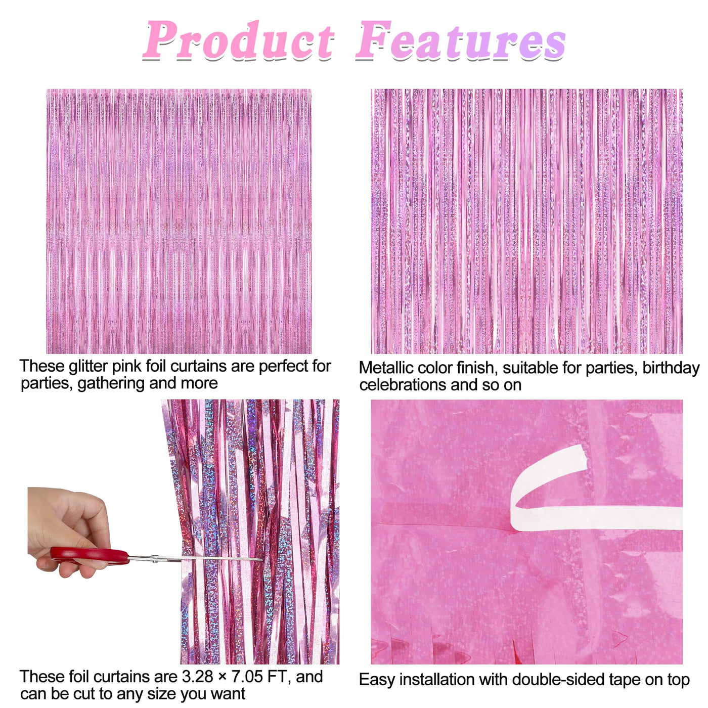 Celebrate Party With These Glitter Pink Backdrop! Quantity: 2 Pcs Size: 3.28 Ft X 7.05 Ft Colors: Glitter Pink Design: Metallic Glitter Design Features: Large Size: Can Be Cut To Length As Needed Non-Tearable: 23 M Pet Material, Lightweight And Non-Tearable Easy To Install: Comes With Adhesive Tape, No Assembly Required Use Occasions: Valentines, Wedding, Anniversaries, Party, Birthday Warm Tips: These Valentines Backdrop Come With Adhesive Paper, But Please Do Not Stick Them On Rough And Uneven Surfaces.