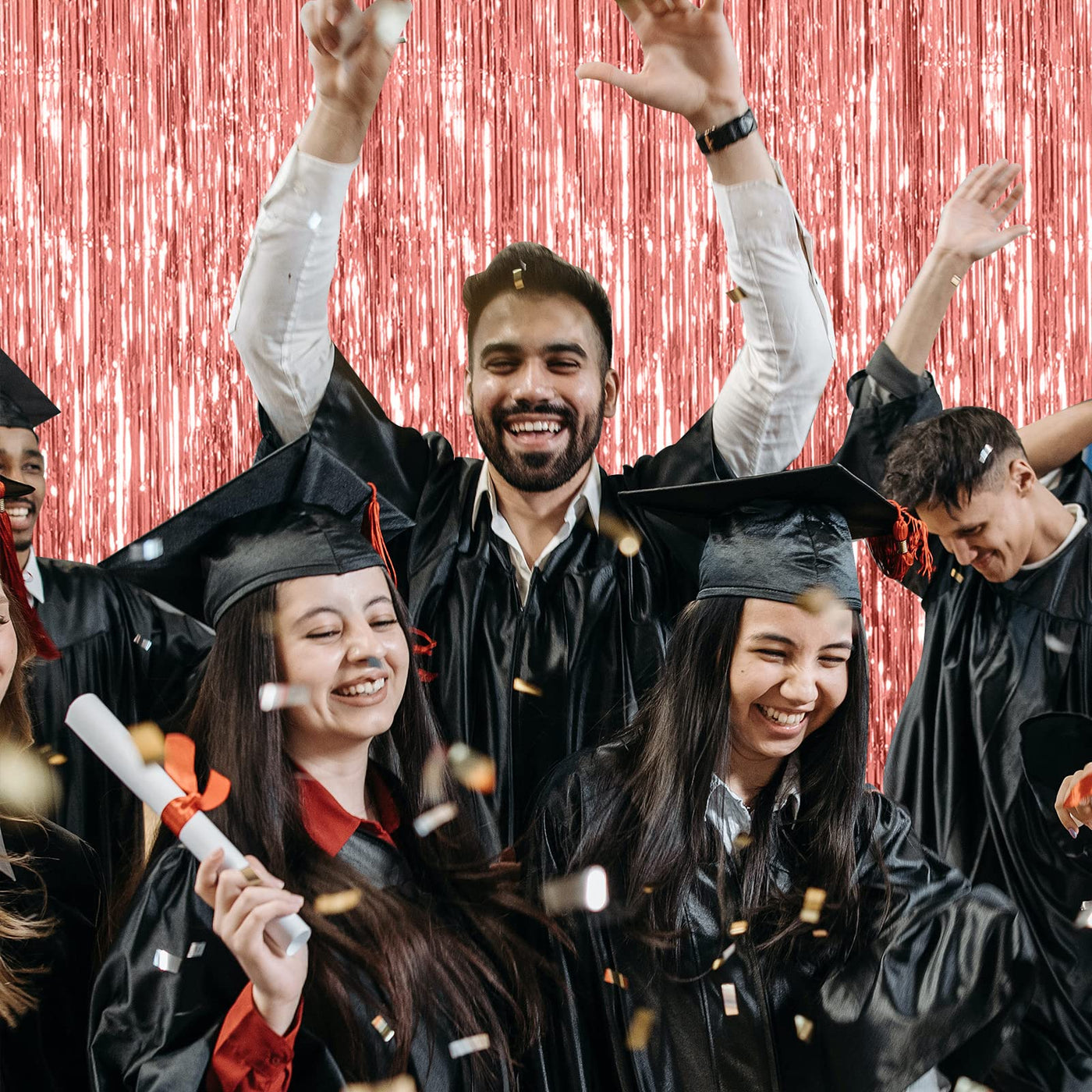 Q: What decorations can I pair with the Rose Gold Foil Backdrops?A: You can enhance your backdrop by pairing it with LED lights, balloons, banners, and various photo props to create a stunning visual display for your party.
