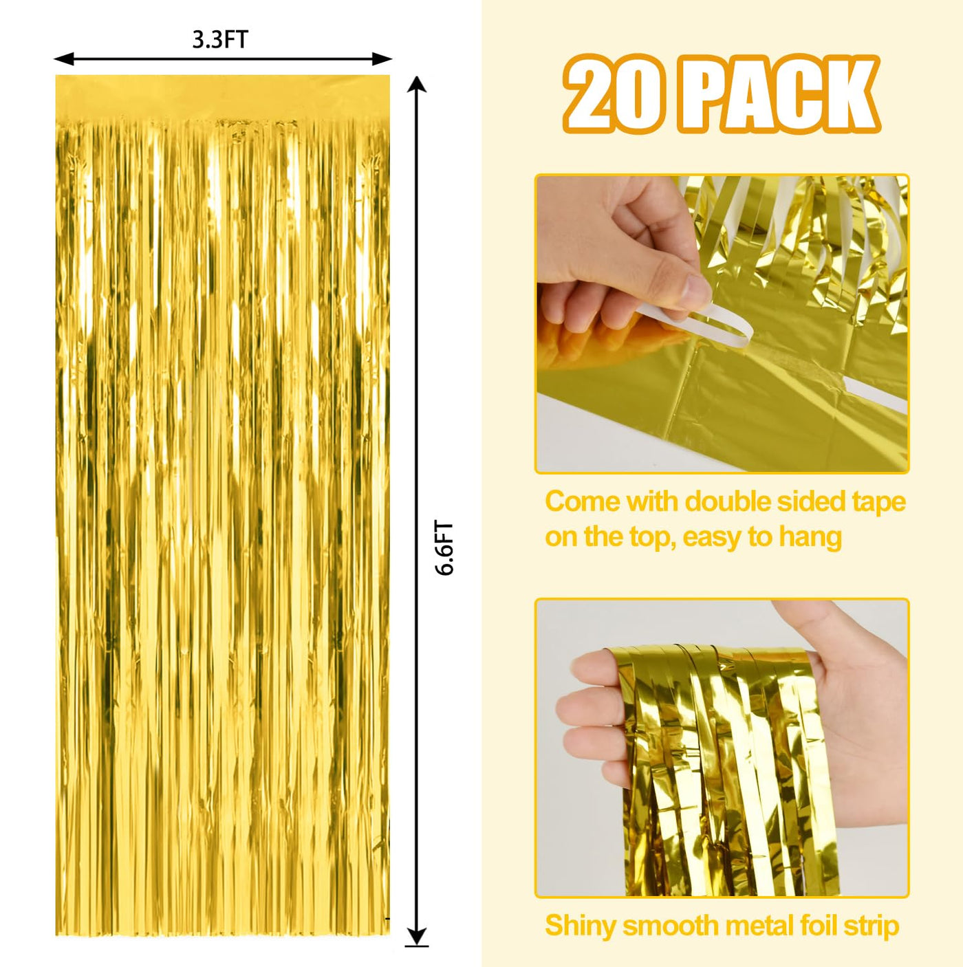 Q: What are the dimensions of the gold metallic tinsel foil fringe curtains?A: Each curtain in the 20 pack measures 3.3 feet wide and 6.6 feet long, making them ideal for various decoration needs.