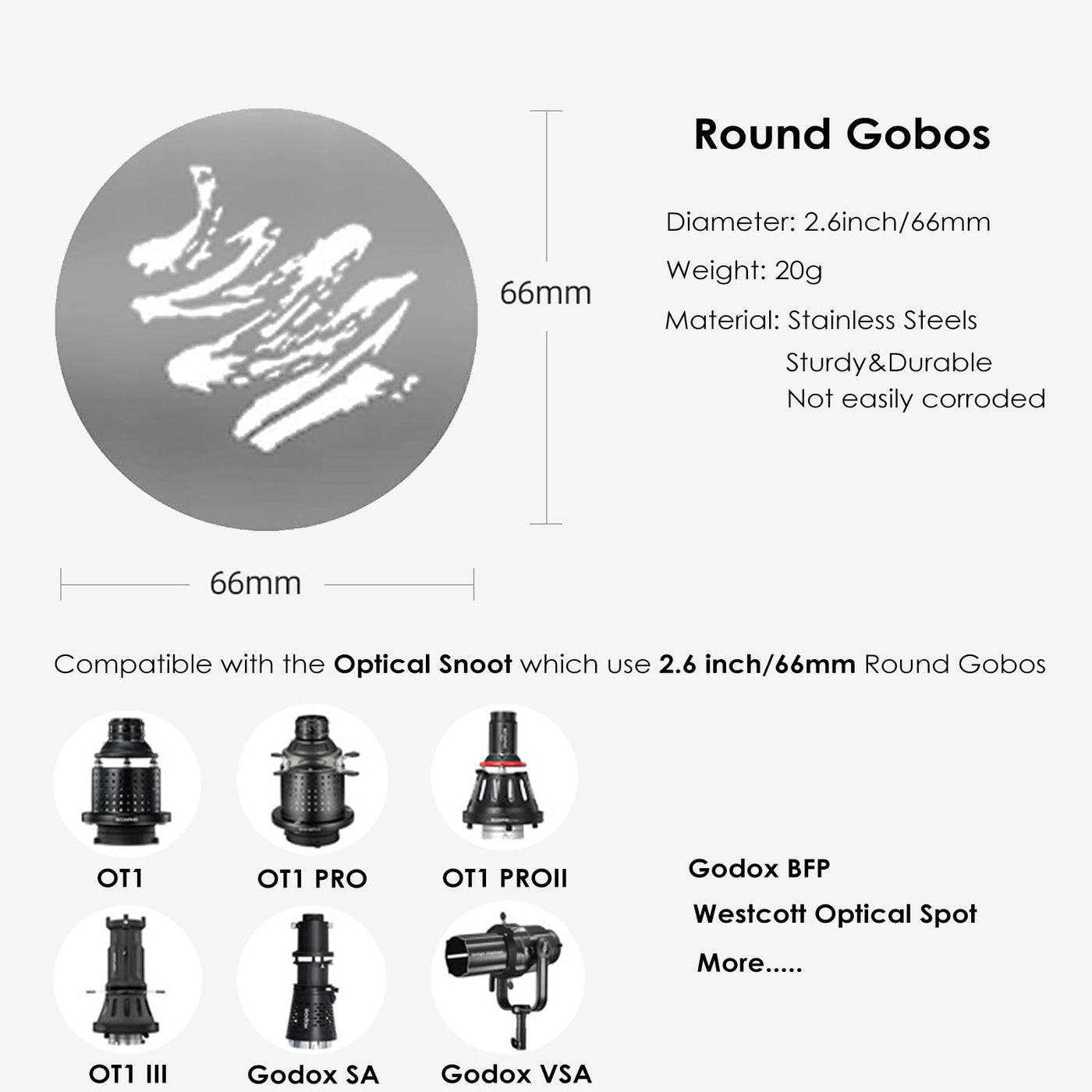 Q: How can I use the gobos to create different effects in my photography?A: To use the gobos, simply insert them into the projection attachment slot of your compatible spotlight. Each gobo features unique patterns that can be projected onto backgrounds or subjects, allowing you to add creative effects and enhance the mood of your portraits, product shots, or video productions.