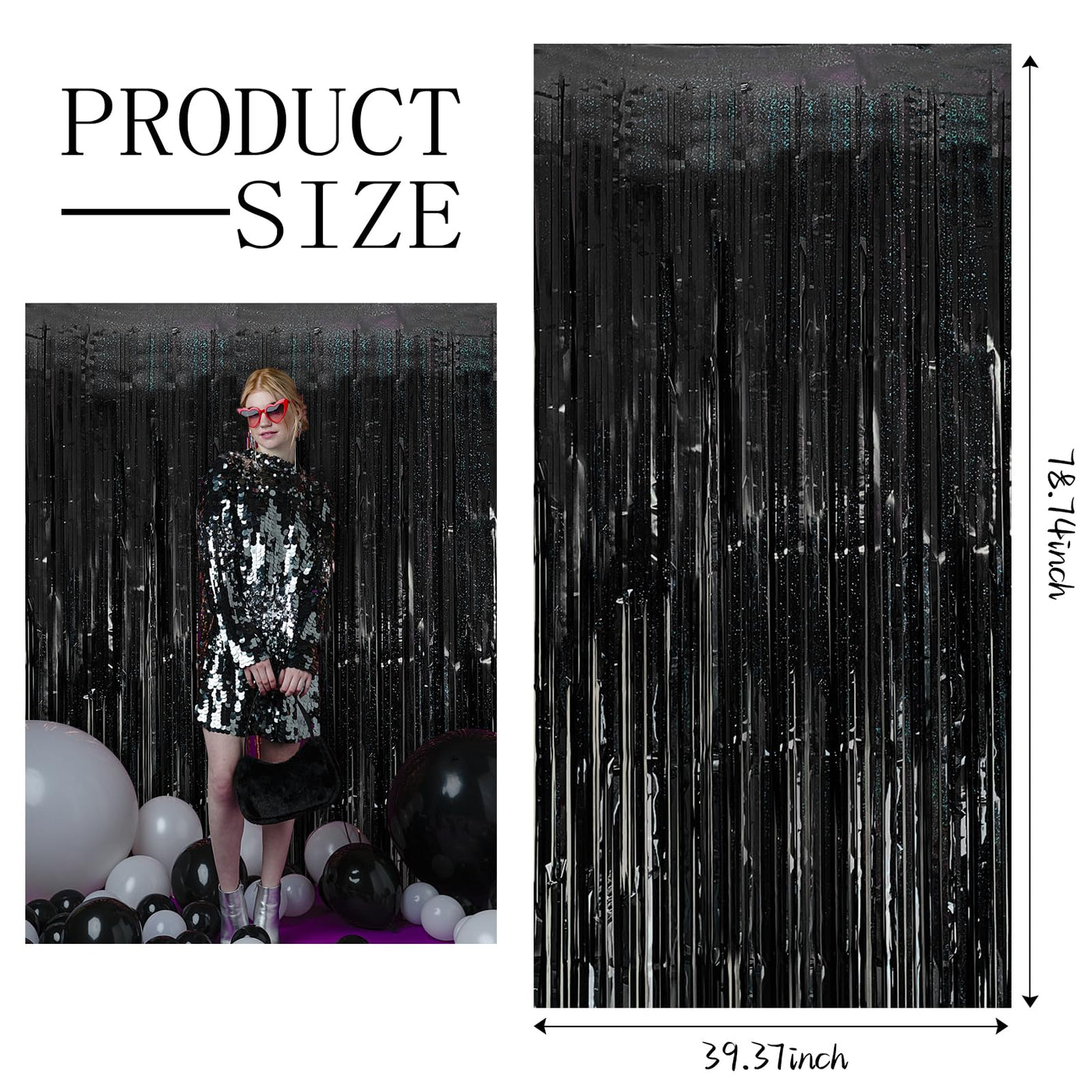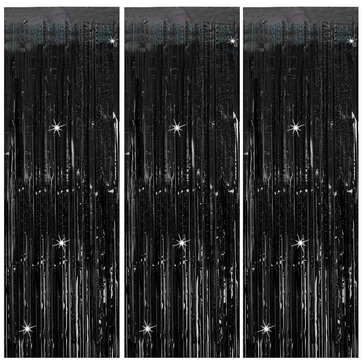 Q: What are the dimensions of the 3 Pack Black Party Streamers?A: Each foil fringe curtain measures 3.28 ft x 6.56 ft, making them suitable for various occasions and spaces.