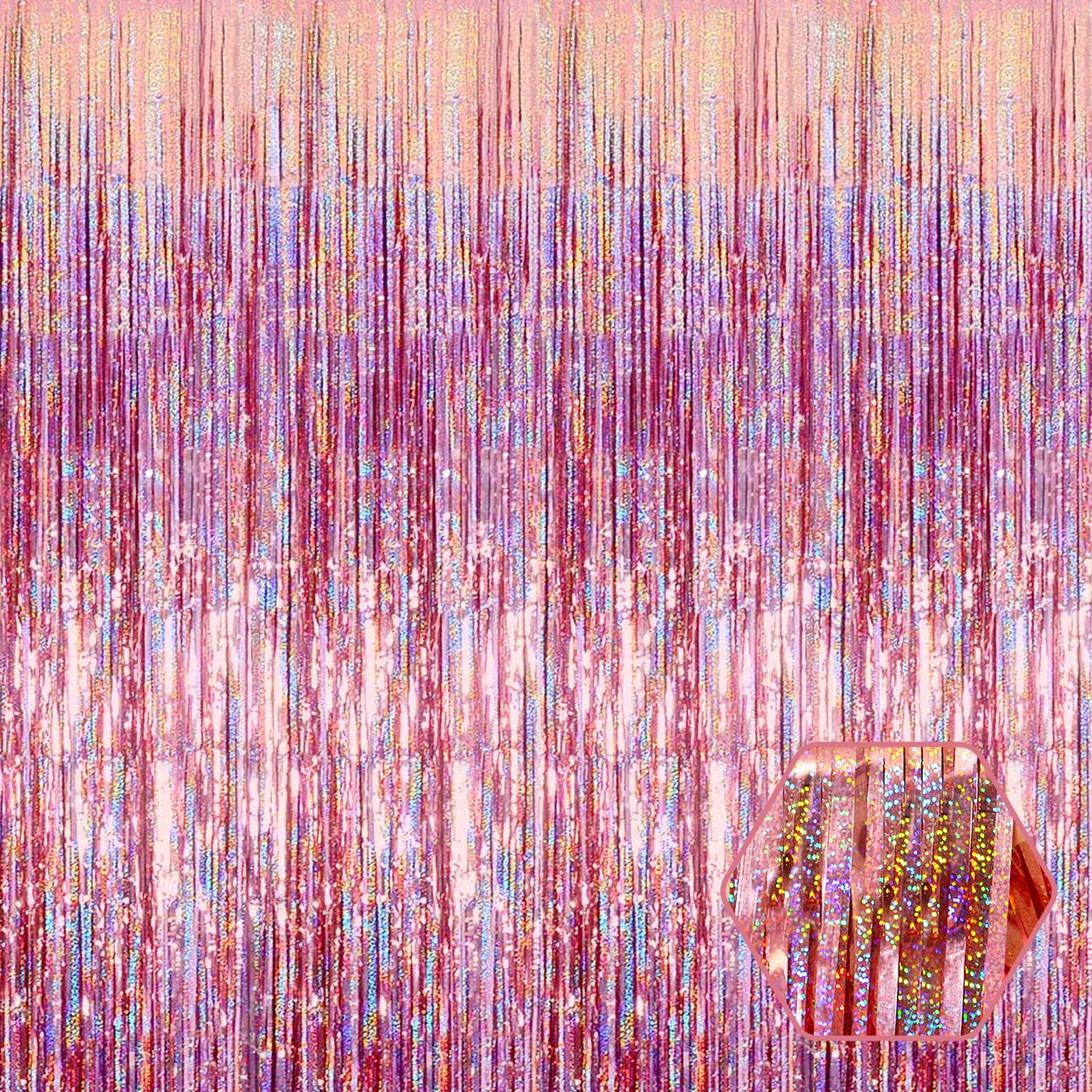 3 Pack Rose Gold Foil Fringe Curtain Backdrop, 3.28Ft X 8.2Ft Metallic Tinsel Foil Fringe Streamer Curtains For Photo Booth, Val