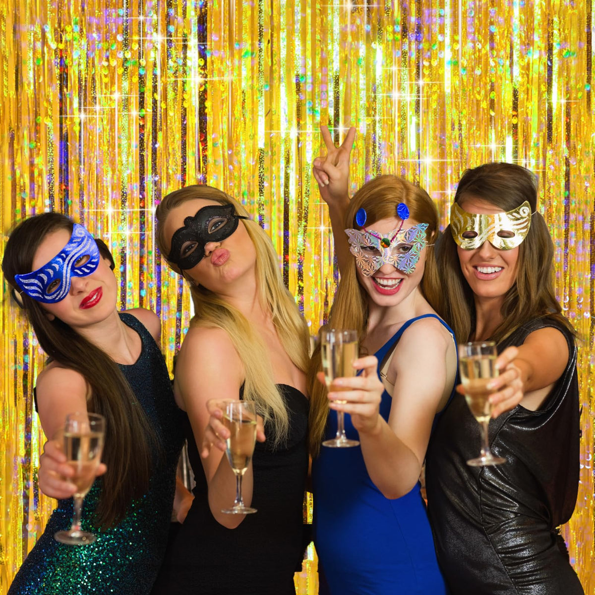 Q: Do the Gold Foil Fringe Curtains have any special design features?A: Yes, the curtains feature a shiny holographic design that reflects different colors like gold, blue, pink, purple, and teal under various lighting, creating an eye-catching effect that enhances your party decor.