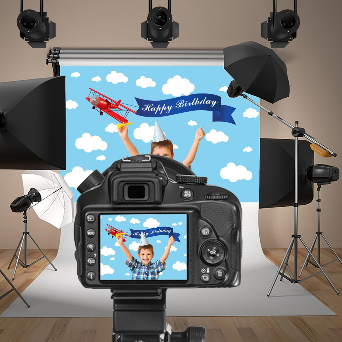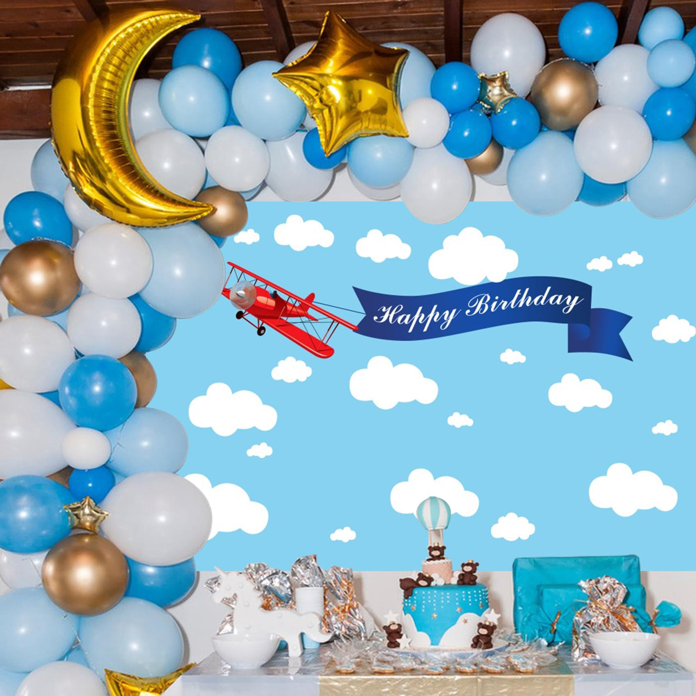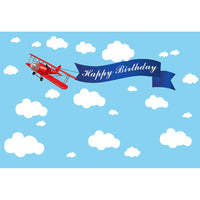 Baocicco 7X5Ft Happy Birthday Red Plane Backdrop Cartoon Plan Blue Sky White Cloud Happy Birthday Photography Background Birthday Party Backdrop Boy Girl Photo Portraits Studio Video Props Booth