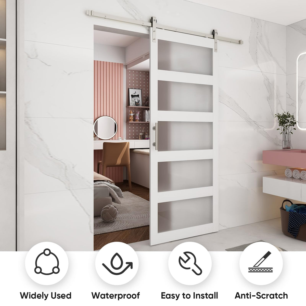 Water-Proof & Scratch-Resistant: The Door Panel Is Made Of Solid Wood,Mdf And High-Hardness Frosted Glass,And The Surface Is Covered With Pvc.It Is Beautiful And Practical.Frosted Glass Can Better Protect Your Privacy. The Protection Of Pvc Makes The Door Surface Smooth,It Not Only Provides Waterproof And Anti-Scratch Functions But Also Is Easy To Clean And Maintain. | Modern Style & Saving Space: The Combination Of Glass And Wood Is Simple And Elegant. Space-Saving Sliding Design Is A Great Idea To Your Living Room, Bathroom, Bedroom, Kitchen, Closet Pantry Or Laundry Room. It Could Fit Any Room Style. | Easy To Assemble And Install: Accessories Are Complete And The Pre-Drilled Holes For The Barn Door Ensure Speed And Ease Of Installation. The Bottom Of The Door Has A Pre-Made Groove For The Floor Guide.We Also Provide A Detailed Professional Installation Manual For Your Reference. | Package List: 36''(W)X96''(H)X 1 3/8''(Thk) White Barn Door(Assemble Required),6.6Ft Stain Nickel Sliding Door Hardware Kit,12'' Stainless Steel Handle,Floor Guide,Allen Key,Installation Manual. | Perfect After-Sales Service: We Have A Professional Customer Service Team 24 Hours Online To Help You,If There Is Any Problem About Our Products,Please Let Us Know ,We Will Try Our Best To Solve Your Problem.