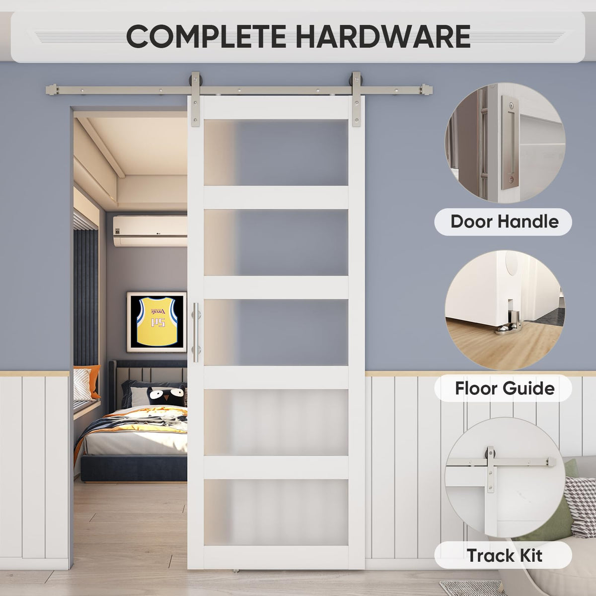 Barnsmith 36In X 96In Glass Barn Door And 6.6Ft Nickle Sliding Door Hardware Included, 5 Panel Frosted Glass, Solid Wood Covered