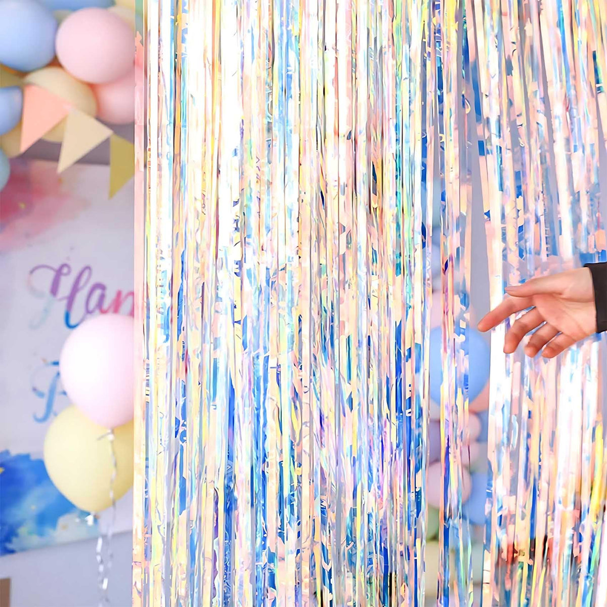 Q: What occasions are these foil curtains suitable for?A: These iridescent foil curtains are perfect for various occasions including weddings, Halloween, Christmas, theme parties, birthday celebrations, bridal showers, baby showers, New Year's Eve, bachelorette parties, graduations, and nursery decorations.