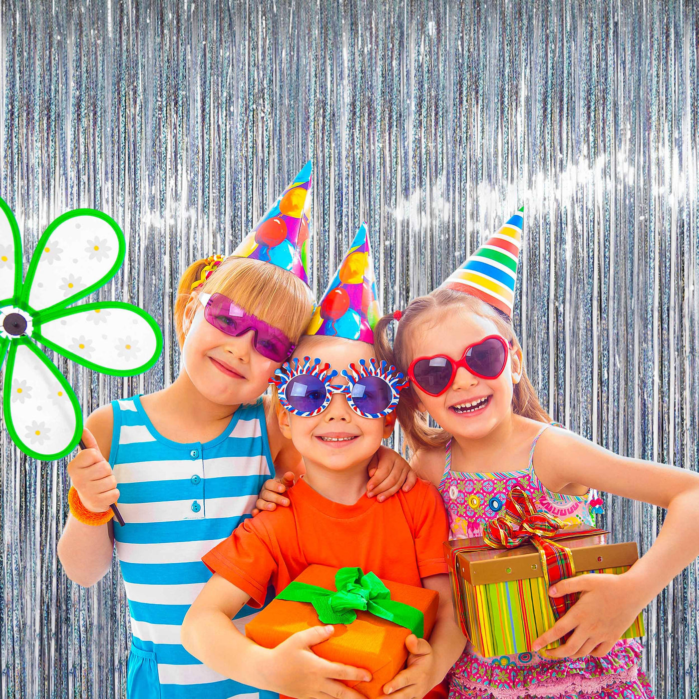 Q: What are the materials used in the foil curtain backdrop?A: The foil curtain backdrop is made of high-quality tinsel, featuring a shiny surface that adds a festive touch to your party decor.
