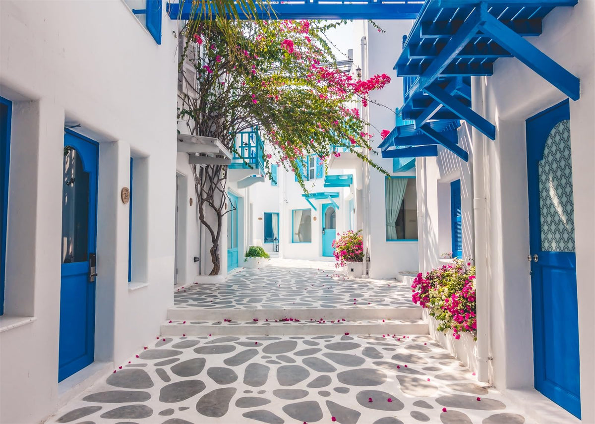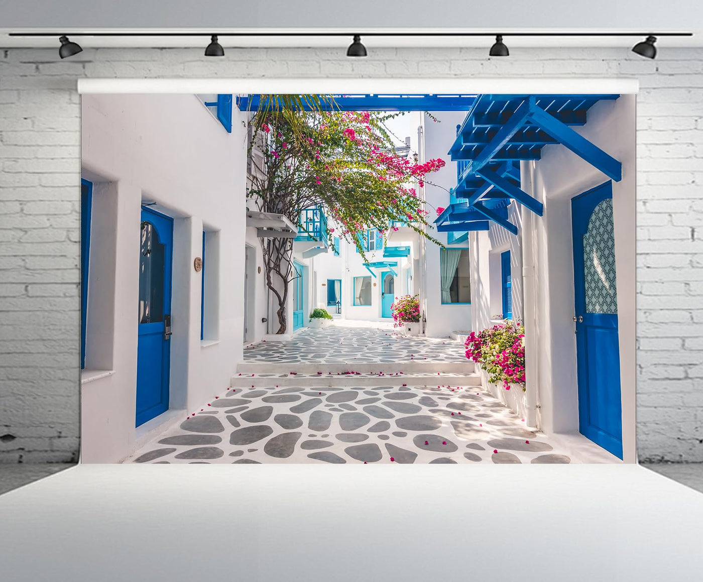 Chnywork 7Ftx5Ft Greece Backdrop Santorini Morocco Blue Window Flowers Street Scenery Photo Background For Greece Wedding Birthd