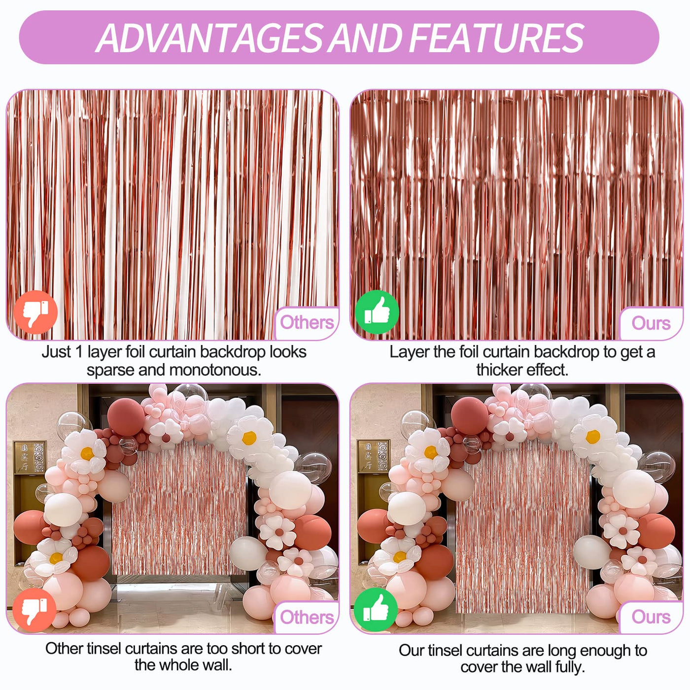 Q: What types of events are suitable for these backdrop curtains?A: These versatile fringe backdrops are perfect for a wide range of events, including birthdays, weddings, baby showers, graduations, and holiday parties.