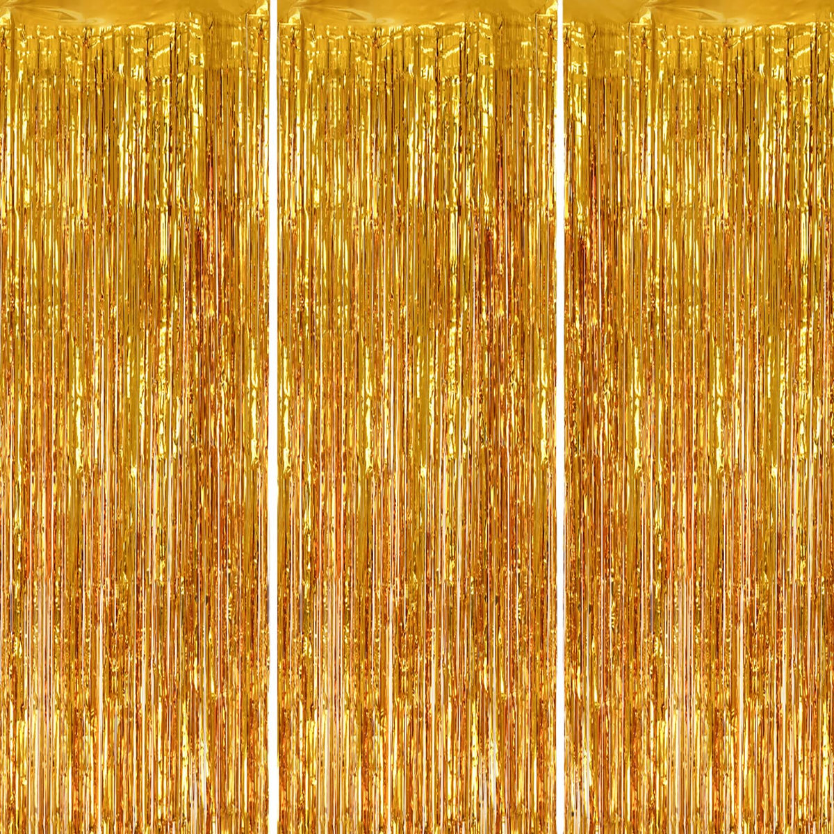 Decockrat 3 Pack Foil Fringe Backdrop Gold Shiny Tinsel Curtains For Party Decoration/Photo Booth Props 3.3X8.2 Ft Metallic