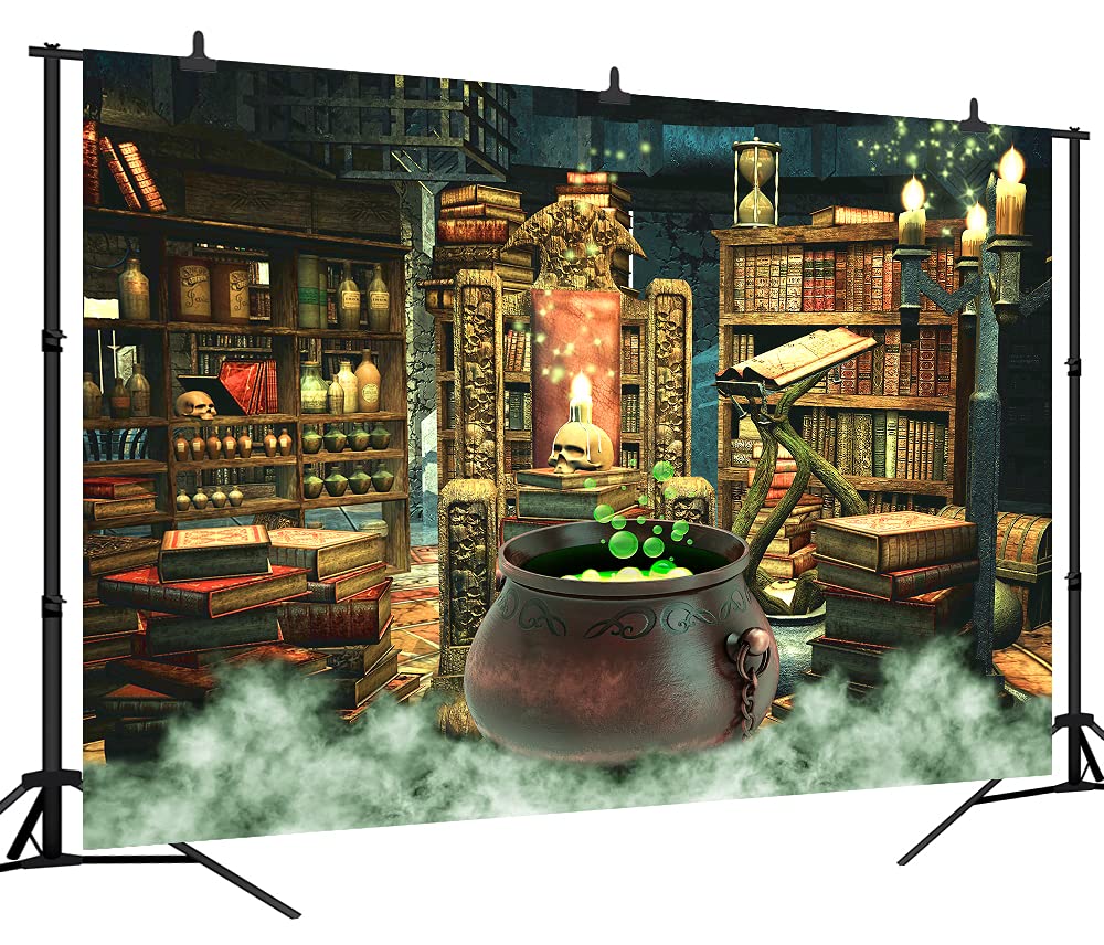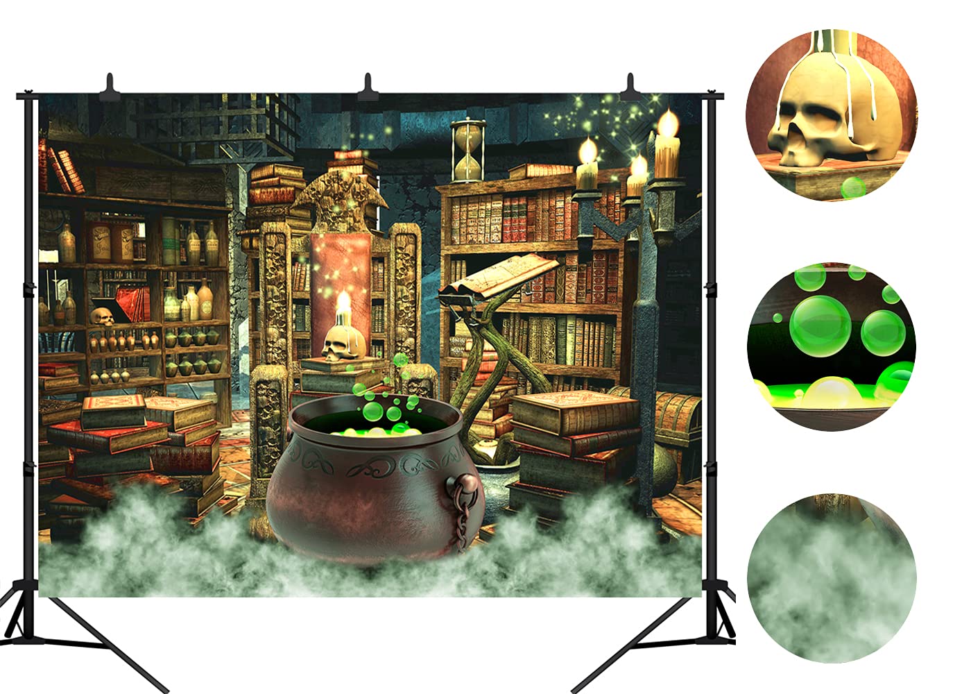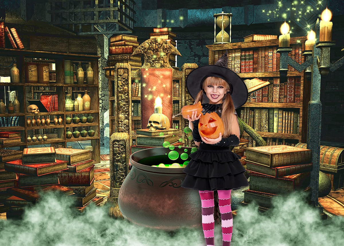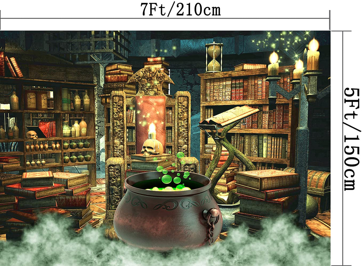 Dephoto Halloween Photography Backdrop Witch Magic Cauldron Bookshelf In Spooky Room Party Decoration Portrait Background Vinyl Photo Studio Booth Props Pgt646A 7X5Ft
