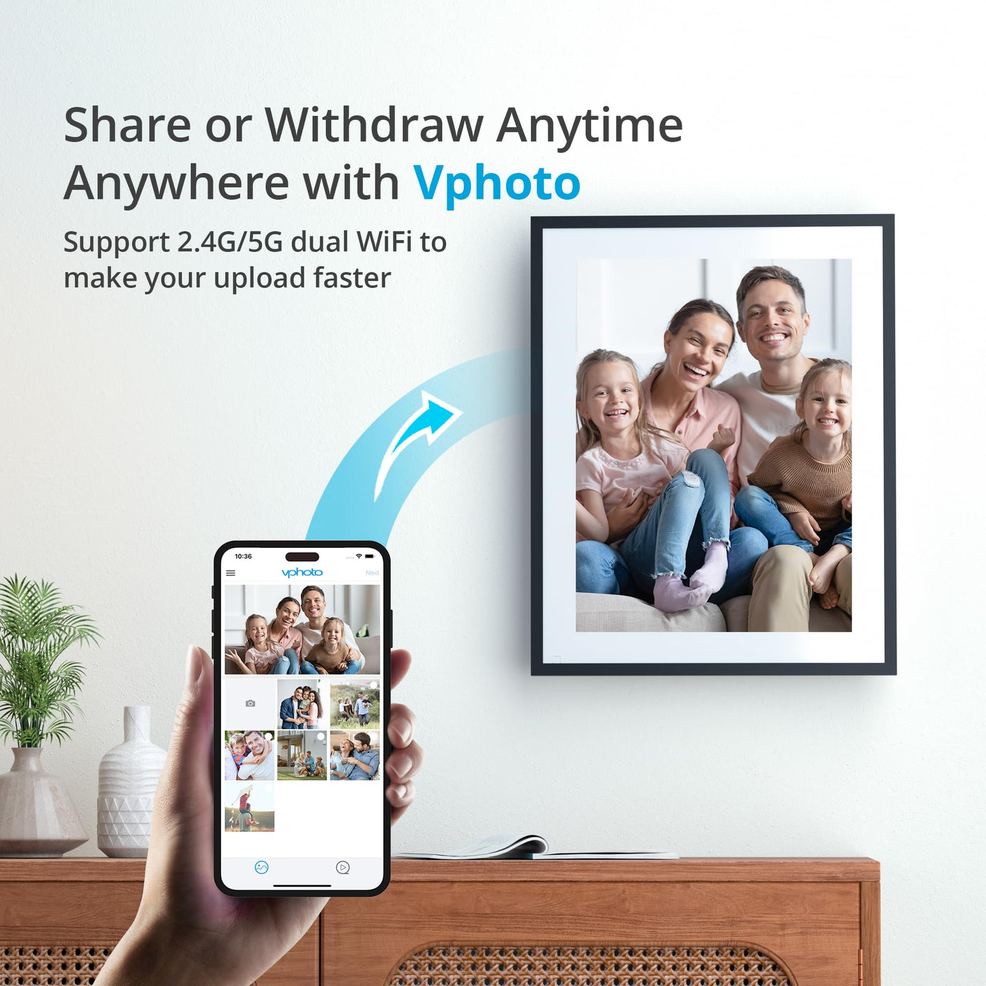 Perfect For Gifting: This Digital Photo Frame Captures And Cherishes Every Precious Moment. Invite Up To 30 Friends And Family To Send Photos Directly To The Same Frame For A Warm Surprise For Grandparents, Moms, And Anyone Who Loves Memories. | 16.7 Inch 4:3 Touch Screen: Our Digital Frame Has 1280*960 Ultra-High Resolution, 16:9 Aspect Ratio. The Large Touch Screen Supports Wall-Mounting, Landscape Or Portrait Orientation, And The Photos Are Automatically Rotated. Ips Technology Lets You View Your Most Precious Moments With Wide Viewing Angles And Accurate Color Reproduction. | Easy And Fast: You Can Download The Vphoto App And Use It For Free For Life. You Can Easily Set It Up Within 1 Minute. This Digital Photo Frame Adopts 2.4G+5G Dual Wifi Technology, Allowing You To Instantly Transfer 50 Photos At One Time, Bringing You A Wonderful Experience. | 32Gb Large Memory: This Digital Picture Frame Built-In 32Gb Memory, It Also Supports Tf Card (Max 64G) And Usb Drive Connection, Enabling You To Read Files And Export Received Photos And Videos For Better Management Of Albums.
