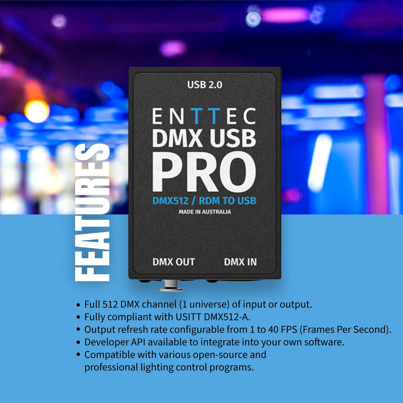 Need To Get Your Computer Hooked Up To Your Lights? You Need The Enttec Dmx Usb Pro Interface. With This Super-Fast Interface You Can Control All Of Your Lights From Your Computer. The Dmx Usb Pro Is One Of The Fastest Interfaces On The Market, It Can Push Up To 850 Frames Per Second. You Can Also Use 3Rd Party Controllers And Tools Without Any Issue. Create And Execute Killer Light Shows Right From Your Laptop. Control Your Lighting Rig From Your Computer With The Enttec Dmx Usb Pro.