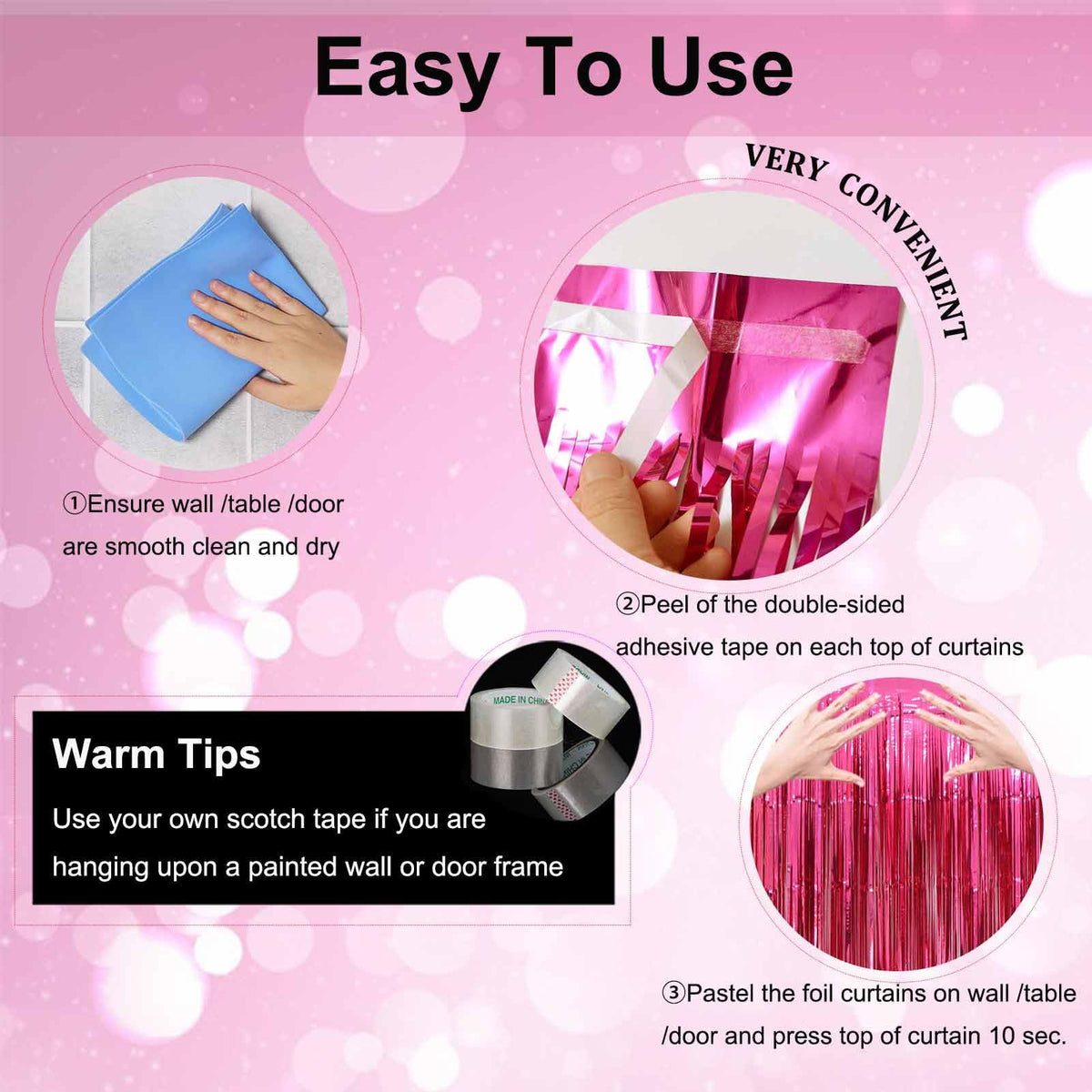 Q: How do I hang the hot pink fringe curtains?A: Hanging the hot pink fringe curtains is simple. Just peel off the backing of the double-sided adhesive tape and stick the curtain onto a clean, dry surface like a wall, door, or table.