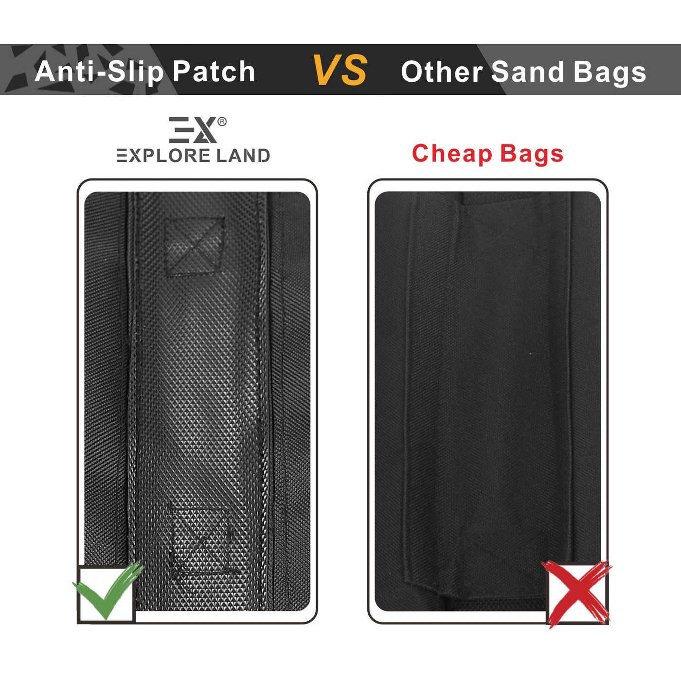 Q: Is the weight bag suitable for outdoor use?A: Yes, the Explore Land weight bag is designed for outdoor use and features a leak prevention system with double hook and loop closures to keep the filler secure, making it ideal for stabilizing photography equipment, gazebos, and patio furniture in windy conditions.