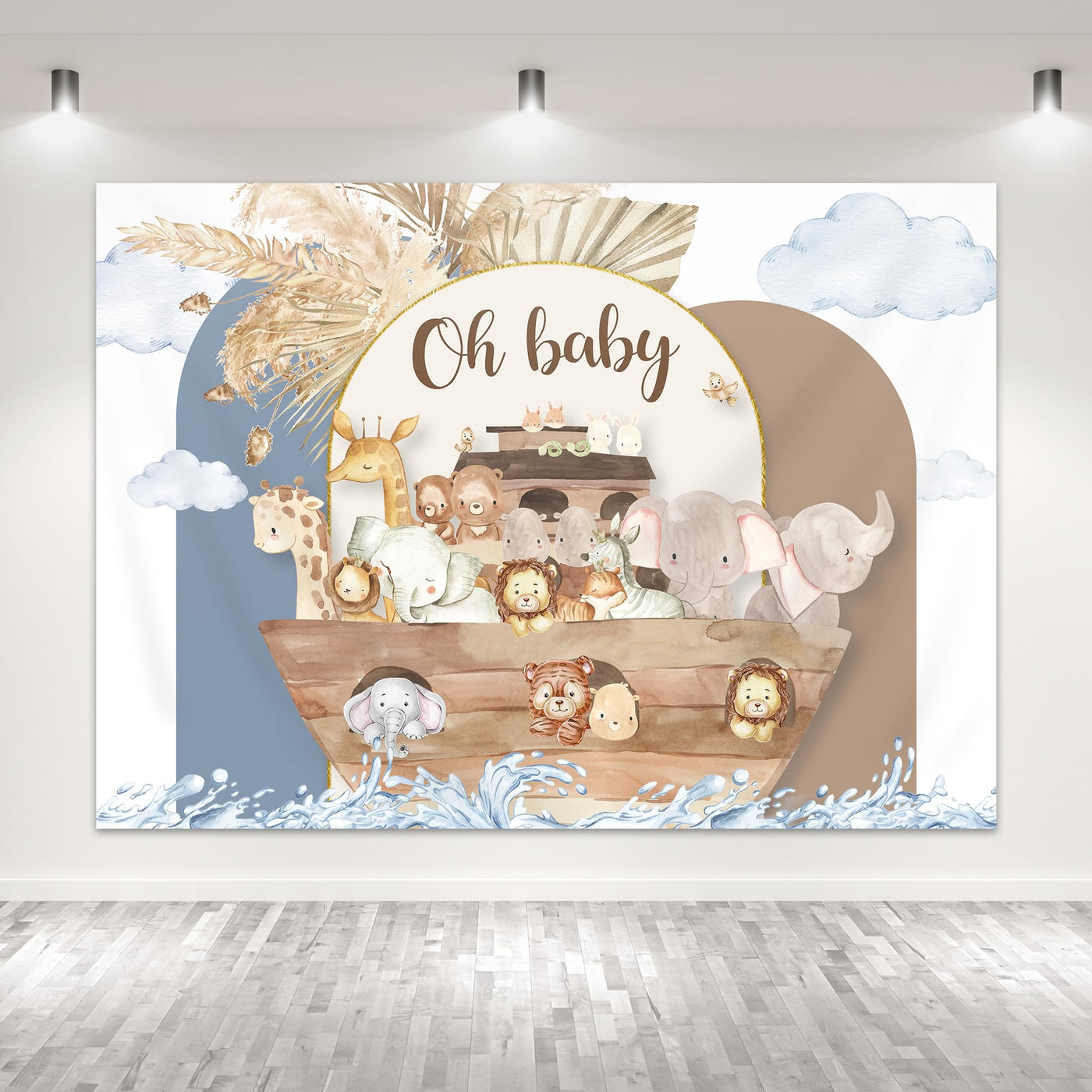 Glawry Noah'S Ark Backdrop For Photography 7Wx5H Feet Oh Baby Boho Blue Pampas Flower Cartoon Woodland Animal Ocean Lovely Cloud