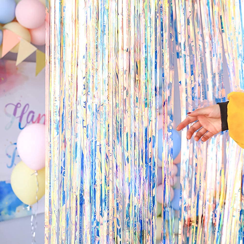 Gorgeous Holographic Party Backdrop Curtains 6.5X8.2 Feet, Pack Of 2 | Iridescent Colorful Fringe Curtain With Non Marking Tap