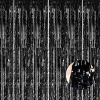 Q: What are the dimensions of the HalloweenDecorate black foil fringe curtain?A: Each metallic tinsel foil fringe curtain measures 3.28 feet wide and 8.2 feet long, making them perfect for various party decorations and backdrops.