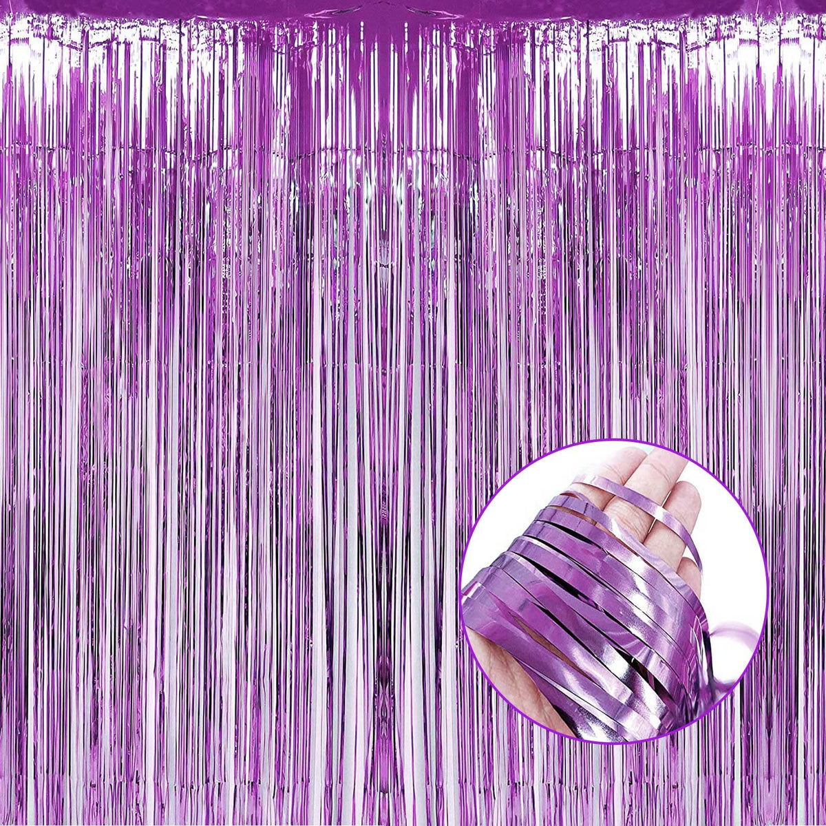 Q: What are the dimensions of the HalloweenDecorate Light Purple Foil Fringe Curtain?A: Each curtain measures 3.2 feet wide and 8 feet long, making them ideal for creating a stunning backdrop for various celebrations.