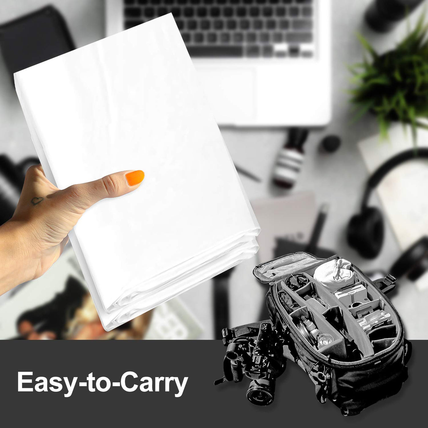 Q: What type of lighting does this backdrop help with?A: The white, non-glossy surface of the backdrop helps to evenly spread light, making it ideal for photography and video work where consistent lighting is essential.