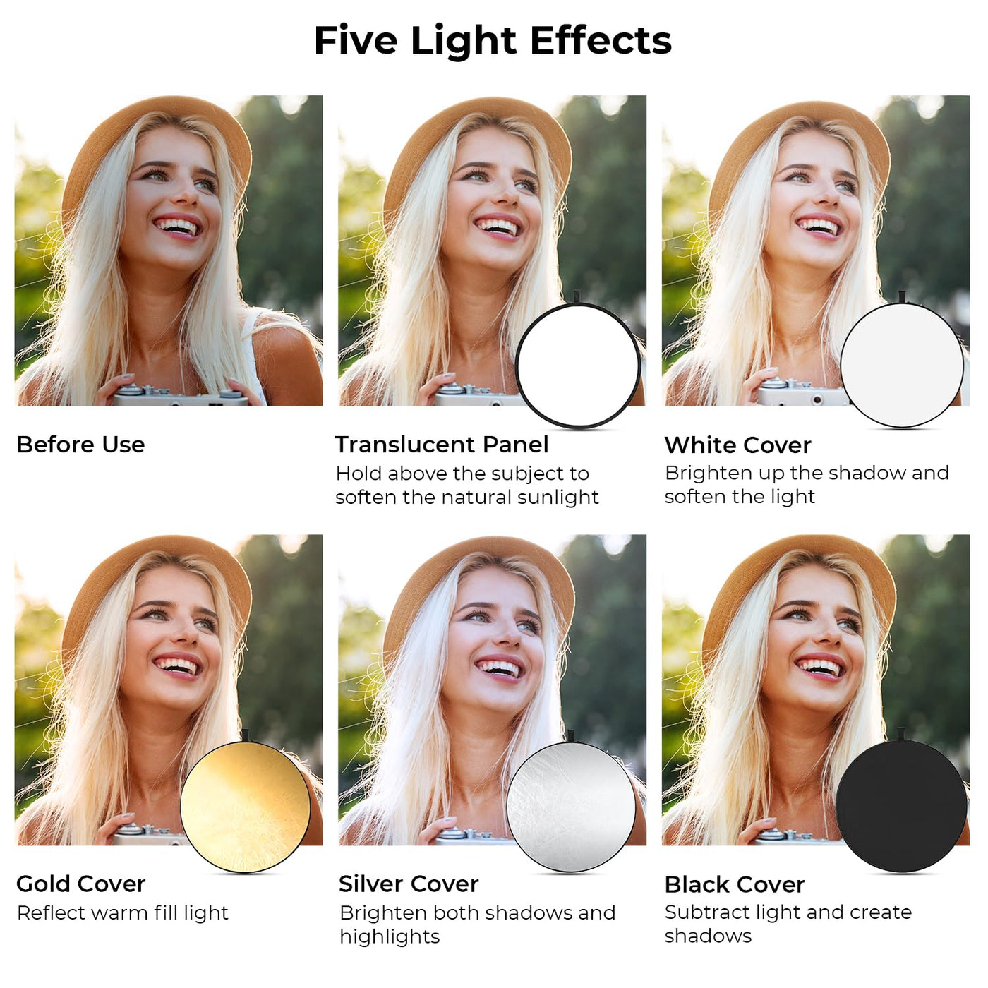 Q: What are the different light effects that the K&F Concept 5-in-1 Light Reflector provides?A: The K&F Concept 5-in-1 Light Reflector offers multiple light effects with its translucent panel and four colored coatings. The translucent panel softens sunlight, the white cover brightens shadows, the gold coating creates warm fill light, the silver coating brightens shadows and highlights, and the black cover subtracts light to create shadows.
