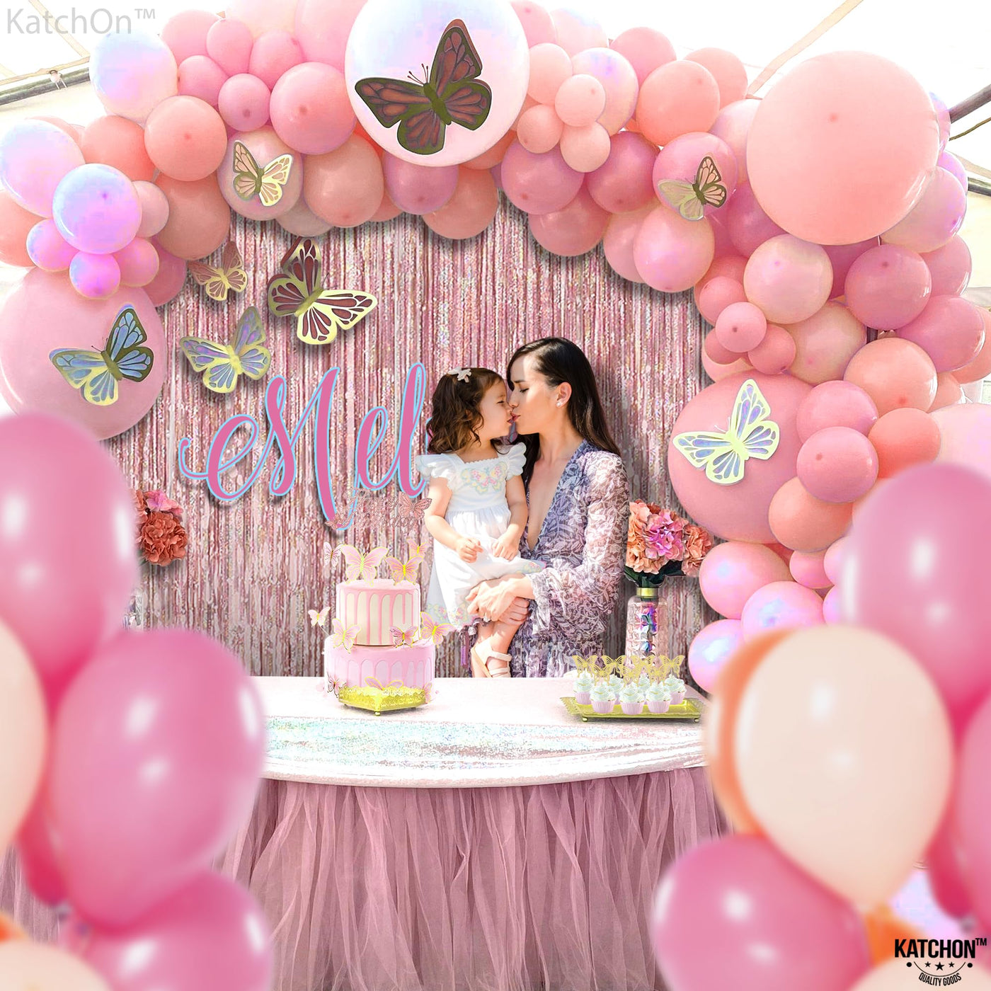 Q: What are the dimensions of the KatchOn Iridescent Rose Gold Fringe Curtain?A: The KatchOn Iridescent Rose Gold Fringe Curtain measures 3.2 x 8 feet, making it an extra-large backdrop perfect for various party decorations.