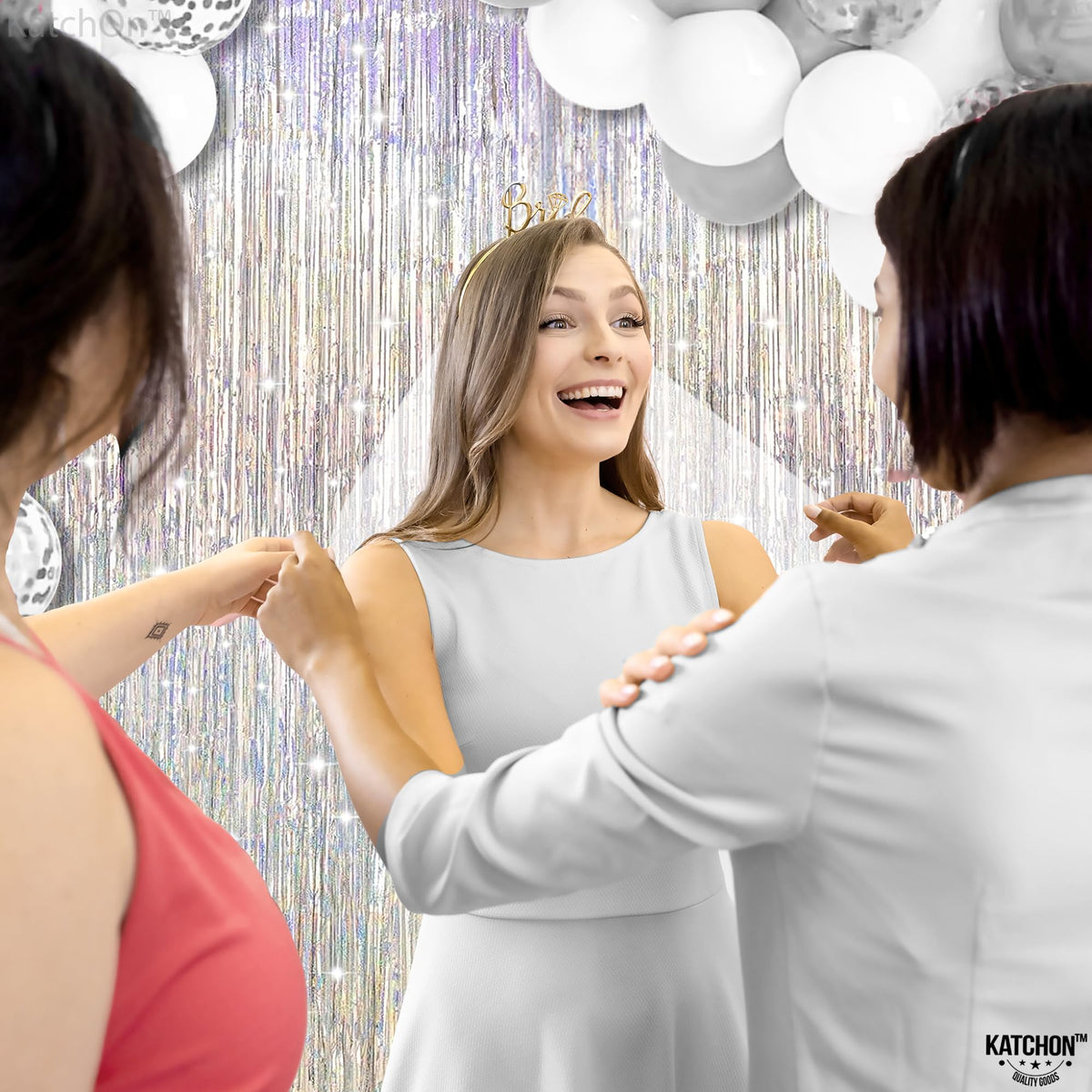 Q: What are the dimensions of the KatchOn Iridescent Silver Backdrop Curtain?A: The KatchOn Iridescent Silver Backdrop Curtain measures 3.2 feet in width and 8 feet in height, making it an Xtra Large option for various party settings.