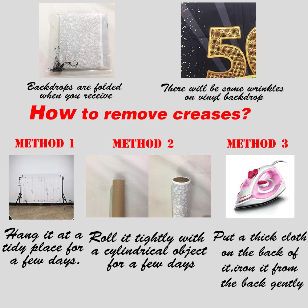 Q: How can I remove creases from the backdrop?A: To remove creases, you can iron the backside of the backdrop with a low-temperature setting, stretch it with heavy objects at the corners, or roll it tightly using a cylindrical object.