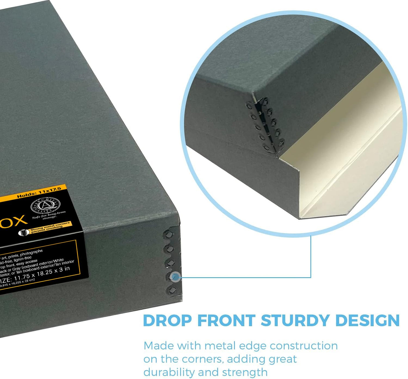 Lineco, Gray 11X17 Museum Storage Box Removable Lid And Drop Front Design. Archival With Metal Edge. Preserve Longevity, Store Photos, Documents, Crafts, Cards, Magazines, Prints, Diy, Pack Of 2