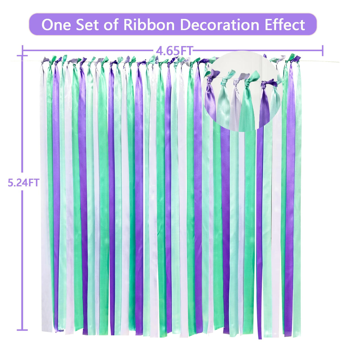 Q: How long are the ribbons in the decorative kit?A: Each color ribbon in the kit is 49.2 feet long and 1.97 inches wide, totaling 197 feet (65.67 yards) across all four colors: Purple, Aqua, Lavender, and Teal.