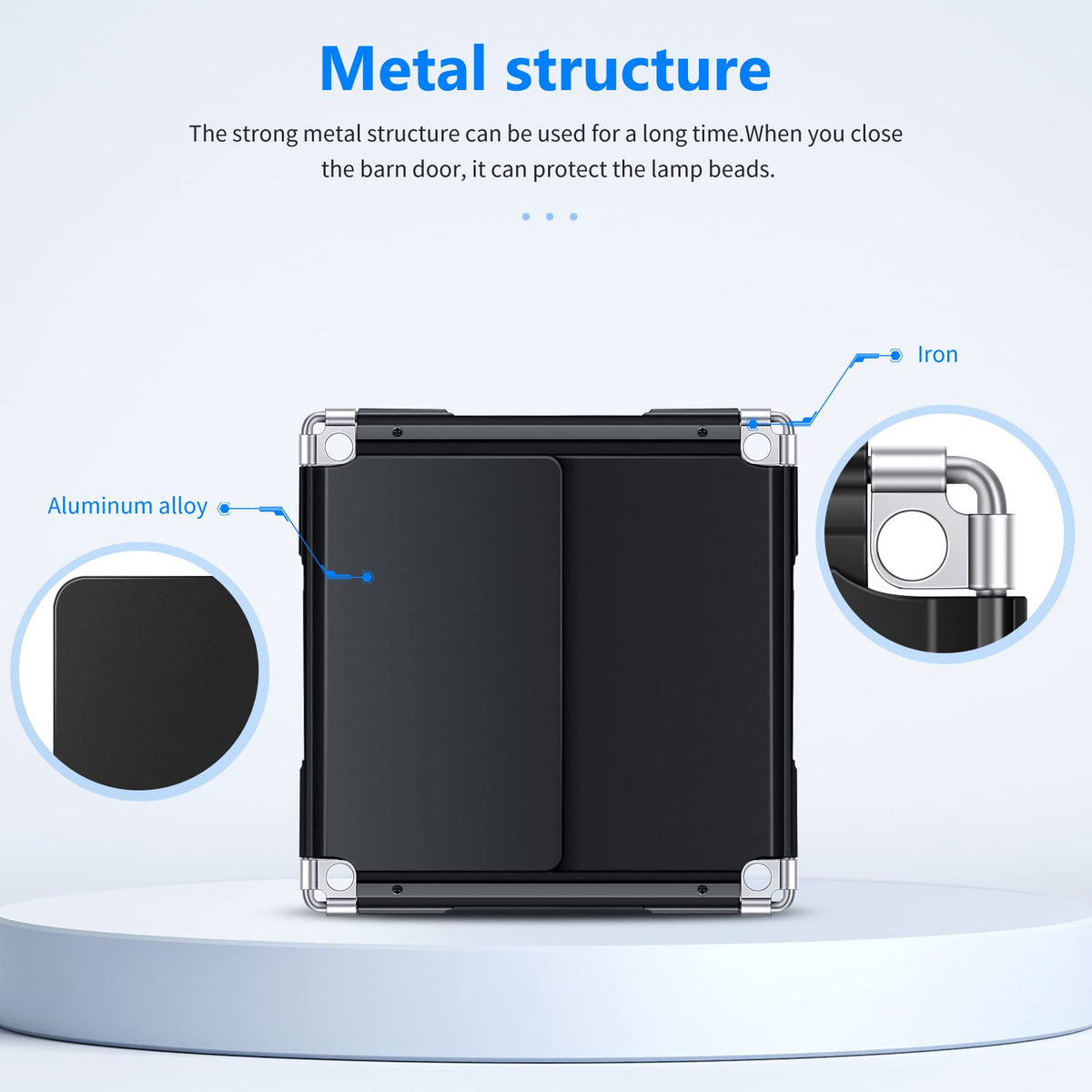 Q: What materials are used in the construction of this barn door?A: The Neewer Barn Door is made of solid metal construction, ensuring durability and stability during use.