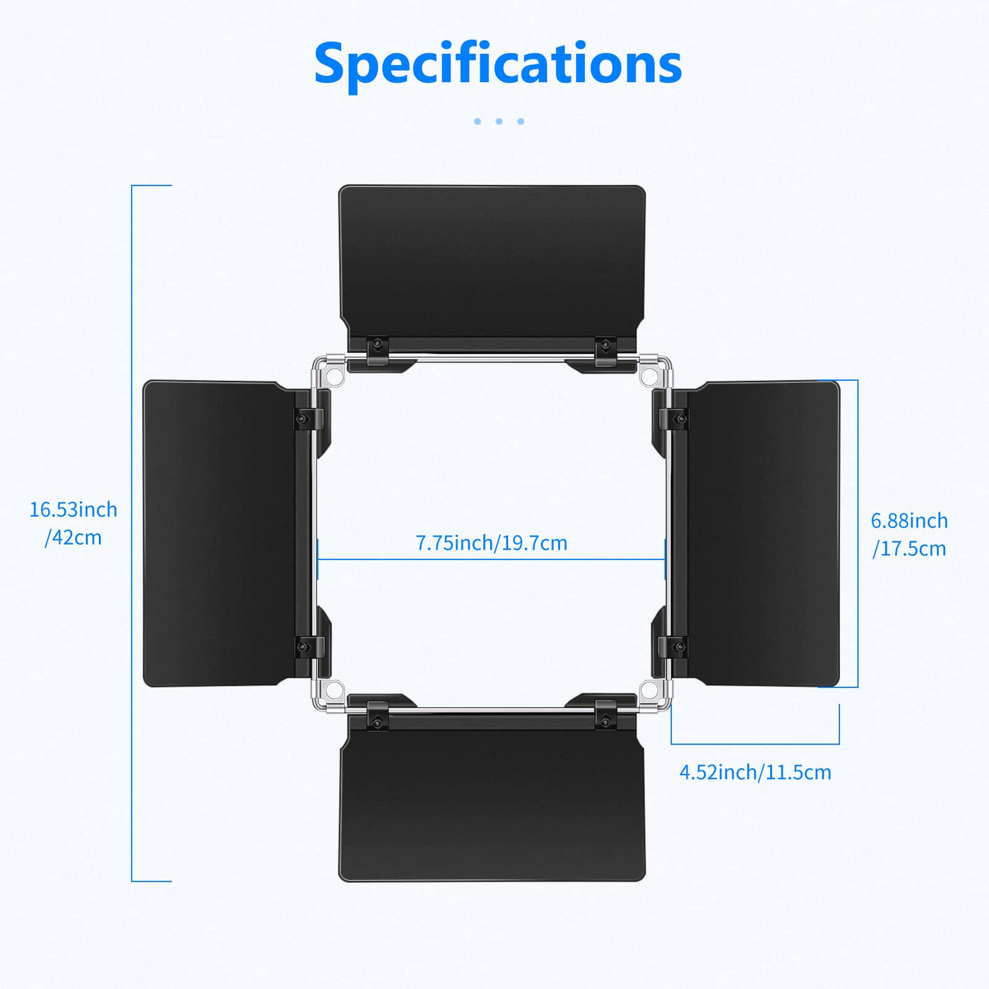 Q: What is the size of the Neewer Professional LED Video Light Barn Door?A: The Neewer Professional LED Video Light Barn Door measures 4.5 inches in width and 6.9 inches in height (11.5 x 17.5 cm).