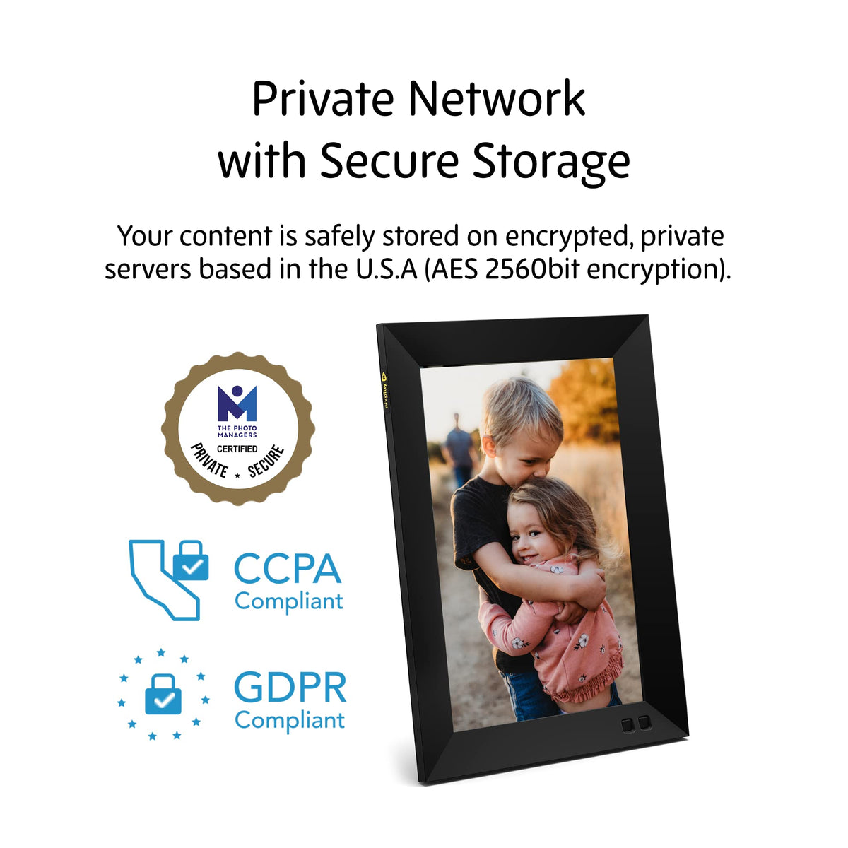 Q: What should I know about the privacy features of the Nixplay frame?A: Nixplay prioritizes privacy by storing photos on secure, encrypted servers located in the USA, ensuring compliance with CCPA and GDPR regulations. Your shared content is kept safe and private.