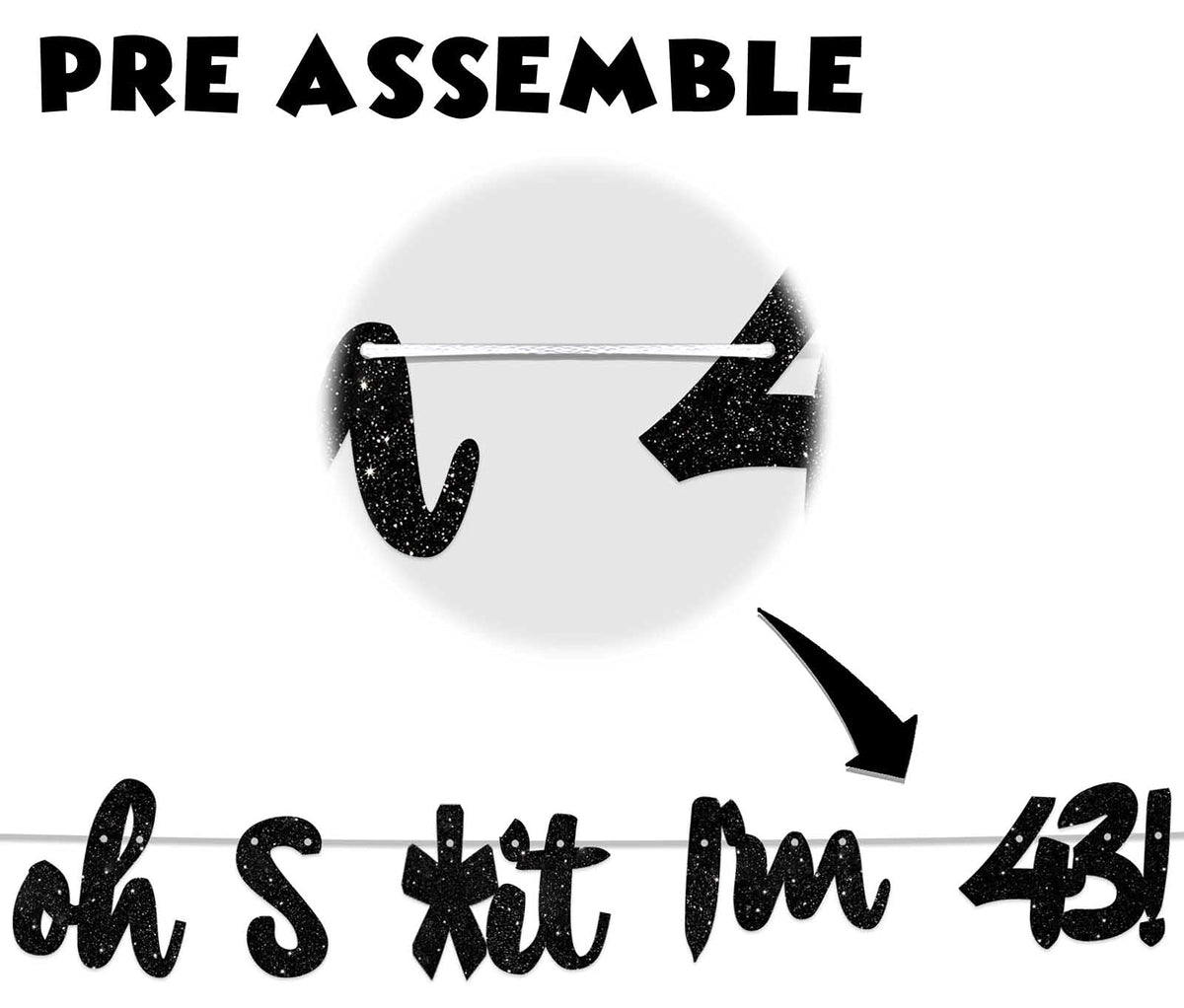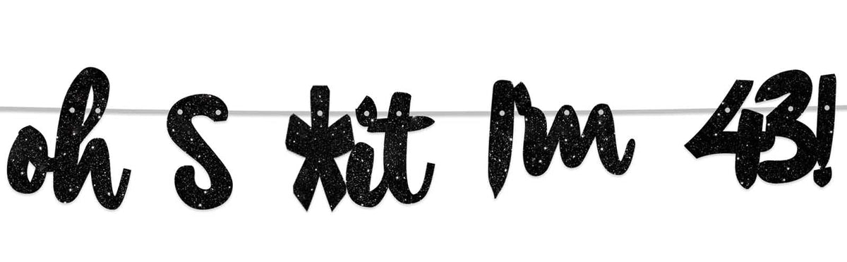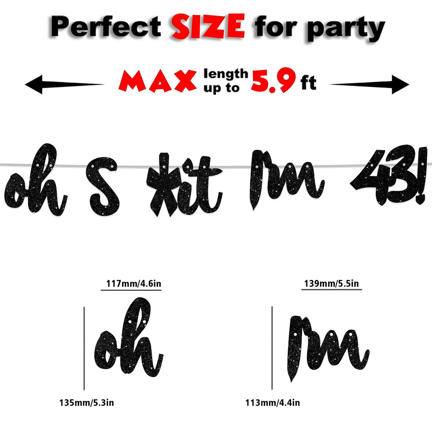 Q: How long is the Oh I’m 43! Banner, and what are its dimensions?A: The total length of the banner is 5.9 feet. Each 'Oh' has a height of 5.3 inches and a width of 4.6 inches, while each 'I'm' measures 4.4 inches in height and 5.5 inches in width.