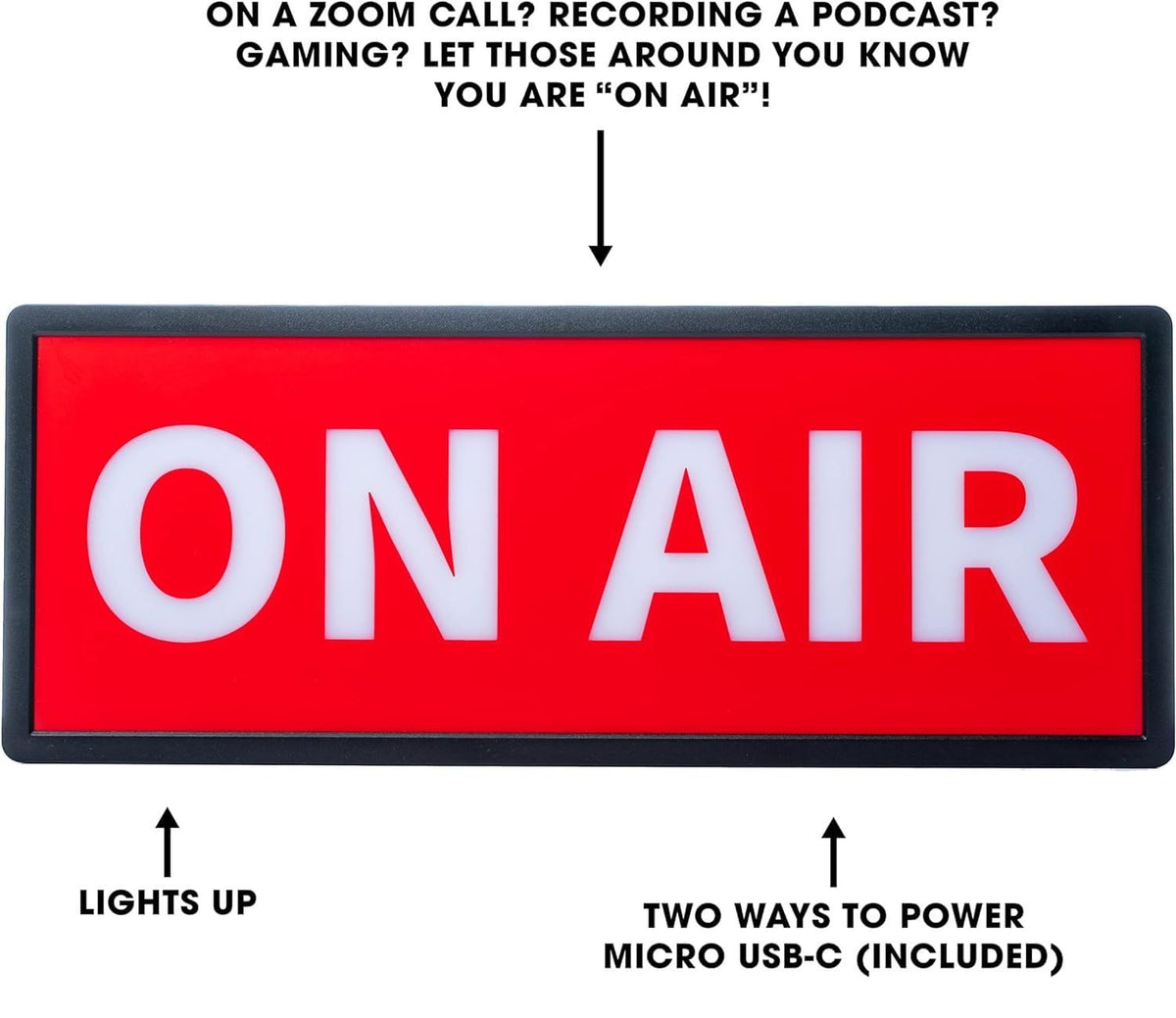 Q: How do I power the On Air Sign?A: The On Air Sign is USB powered, allowing for easy plug-and-play functionality. Simply connect it to a USB power source to illuminate your sign.