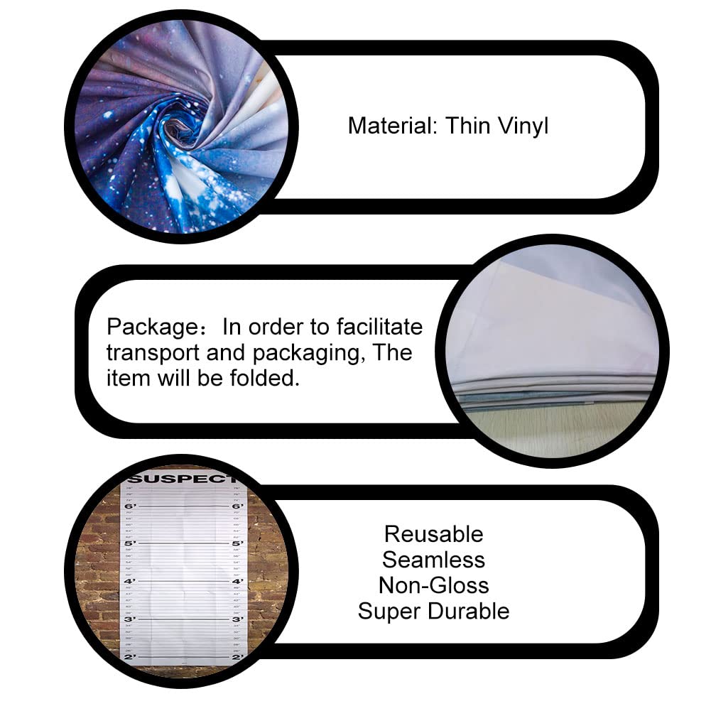 Q: What are the dimensions of the PHMOJEN Police Lineup Backdrop?A: The PHMOJEN Police Lineup Backdrop measures 9 feet wide by 6 feet high, making it ideal for a variety of photo settings and events.