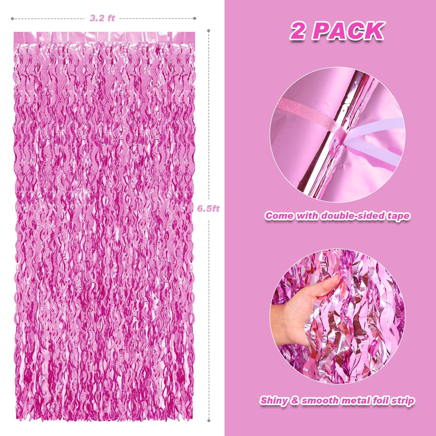 Q: What are the dimensions of the PIGETALE Pink Foil Fringe Curtains?A: Each PIGETALE Pink Foil Fringe Curtain measures 3.2 feet in width and 6.5 feet in height, making them suitable for a variety of decorative purposes.