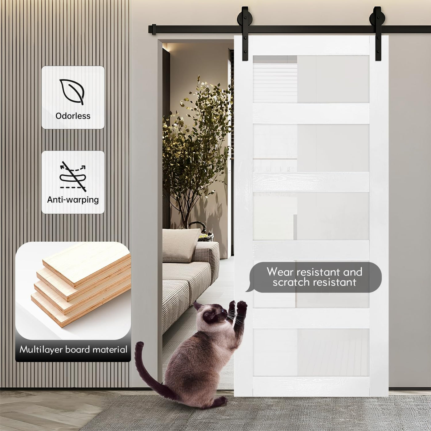 Premium Craftsmanship For Refined Aesthetics: Single Door. Sliding Rail Kit Not Included.Elevate Your Interior Design With Barn Door Panels Crafted From Durable Mdf Material, Boasting A Fine Texture And A Simple Yet Elegant Style. Experience Optimal Thermal Insulation And Efficient Space Utilization With These Sliding Barn Doors, Perfect For Enhancing Room Decor. | Reliable Strength And Endurance: The Glass Sliding Barn Door Features Five Panels Of Frosted Opaque Glass, Providing An Explosion-Proof And Scratch-Resistant Solution. The Robust Door Frames Are Resistant To Rust And Corrosion, Ensuring Durability. Having Undergone Extensive Testing With Tens Of Thousands Of Open-Close Cycles, The Barn Door With Glass Exhibits Remarkable Bearing Capacity. | Effortless Assembly Experience: Our Barn Door Hardware Comes With A Straightforward Installation Manual, Comprehensive Step-By-Step Instructions, And Precise Measurements. | Versatile Styling For Various Spaces: Introduce An Elegant Single Barn Door That Enhances Natural Lighting And Promotes Strong Permeability, Making It A Chic And Versatile Home Decoration. These Interior Barn Doors Seamlessly Complement Spaces Such As Kitchens, Bedrooms, Bathrooms, Garages, And More. | Swift Transformation With Innovative Design: Utilize Our Specially Designed Assembly Structure For A Quick And Convenient Installation Experience. The Door Frame, Adorned With White Pvc Skin, Exhibits Both Strength And Beauty. Featuring High-Hardness Frosted Glass On Both Sides, This Modern Barn Door Set Ensures Waterproof, Scratch-Resistant Properties, And Privacy Protection-All Achieved Within A Mere Hour.
