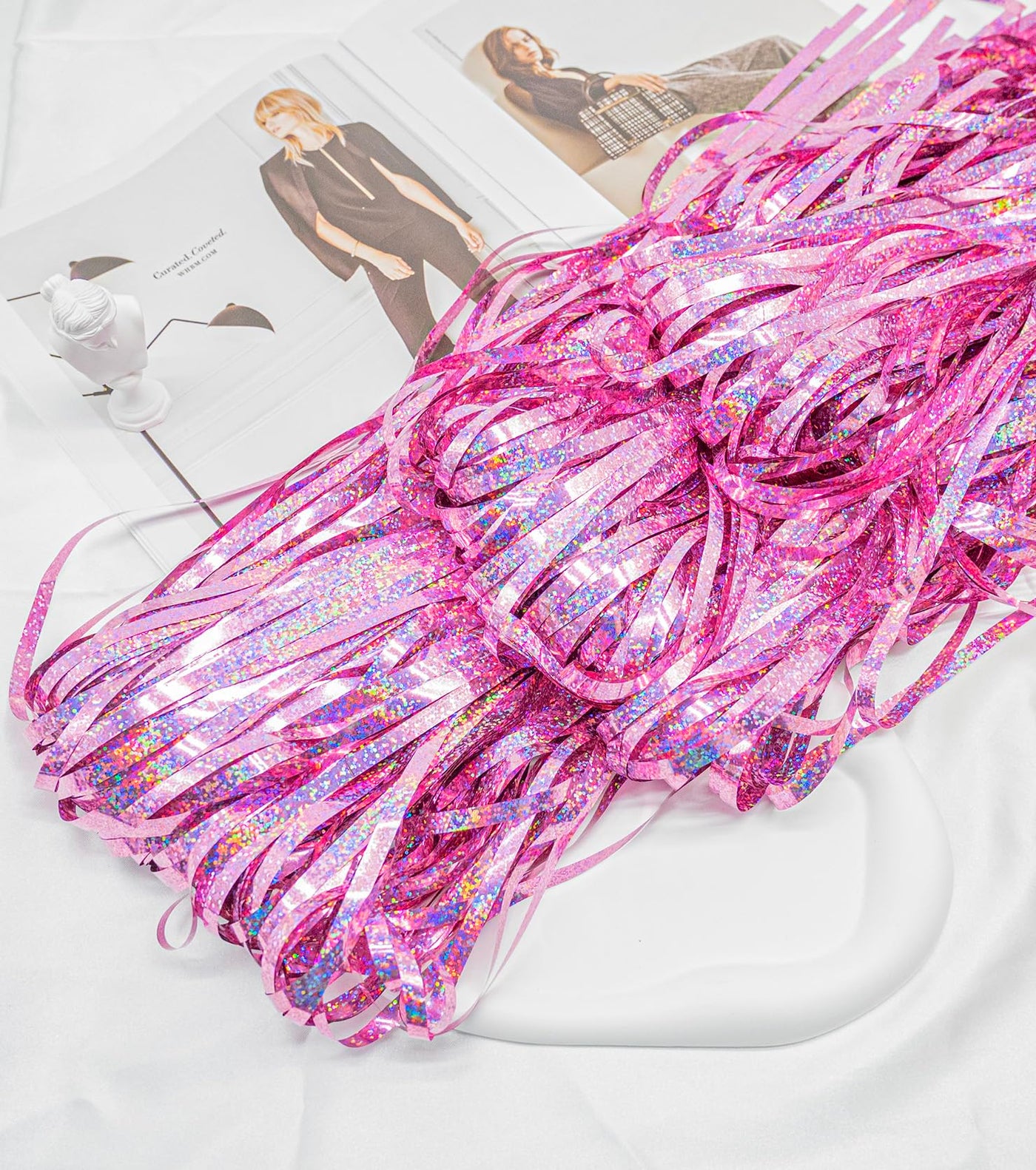 Q: What are the dimensions of the Sharonlily Glitter Pink Foil Fringe Curtain?A: Each curtain measures 3.2 feet wide by 8.2 feet long, making it ideal for various event backdrops.