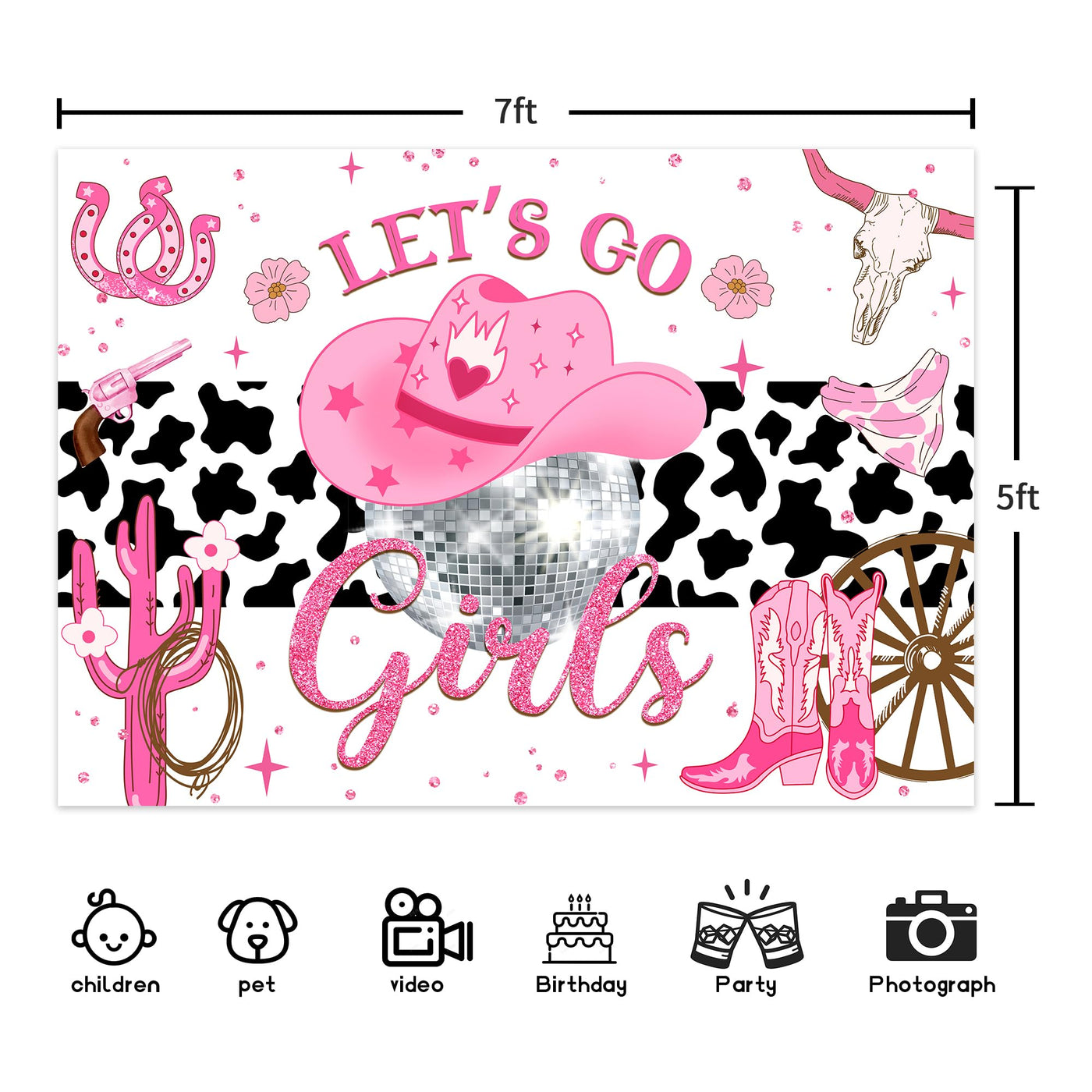 Q: What is the backdrop made of?A: The backdrop is made of high-quality fabric cloth, which is eco-friendly and ensures that the disco cowgirl pattern appears vibrant and realistic.