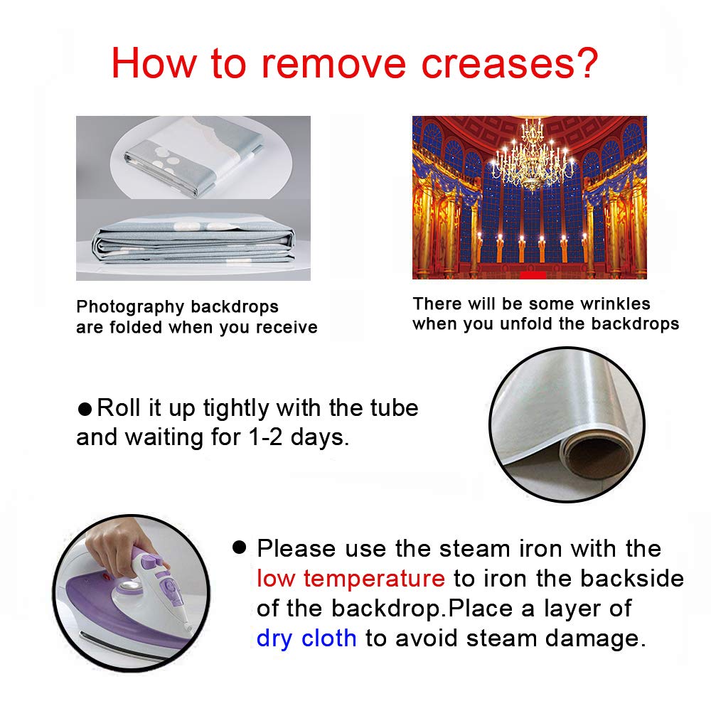 Q: How can I remove wrinkles from the backdrop?A: To remove wrinkles, lay the backdrop flat on a smooth surface, cover it with a 3mm thick cloth, and gently press the creases with a steam iron set to about 80-90 degrees. Repeat this process until the creases lighten or disappear.