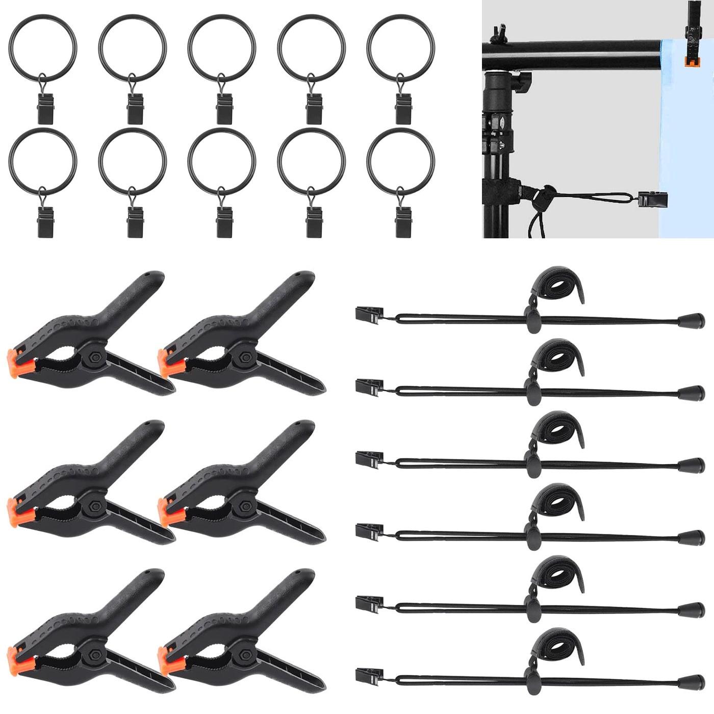 ?Wokape 22 Packs Photography Backdrop Clips Clamps, Include 10 Backdrop Ring Clips, 6 Spring Clamps, 6 Leather Background Clips Holder For Photo Studio Backdrop Background Helper Photo Clamp ?Features: ??Jagged Shape Mouth Help You Secure Firmly In Any Direction. ??High Quality Spring Enhances Clamping Force And Long Service Life. ??Can Easliy Stretching Out The Wrinkles From Muslin Backgrounds. ??Commonly Used Photography Accessories For Photo Studio Background Helper, Home, Woodworking, Etc. ??Meet Your Indoor And Outdoor Use Needs. ?Specifications: ??Colors:Black ??Quantity:22 Packs ?Package Include: ??1Pcs -------- Storage Box ??10Pcs -------- Backdrop Ring Clips ??6Pcs -------- Spring Clamps ??6Pcs -------- Leather Background Clips Holder