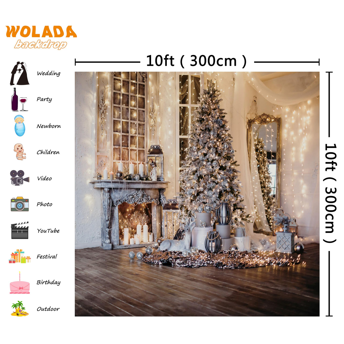 Q: What is the size of the WOLADA Holiday Vintage Gold Christmas Backdrop?A: The WOLADA Holiday Vintage Gold Christmas Backdrop measures 10x10FT (300x300cm), making it ideal for various photography needs, including holiday-themed shoots and parties.