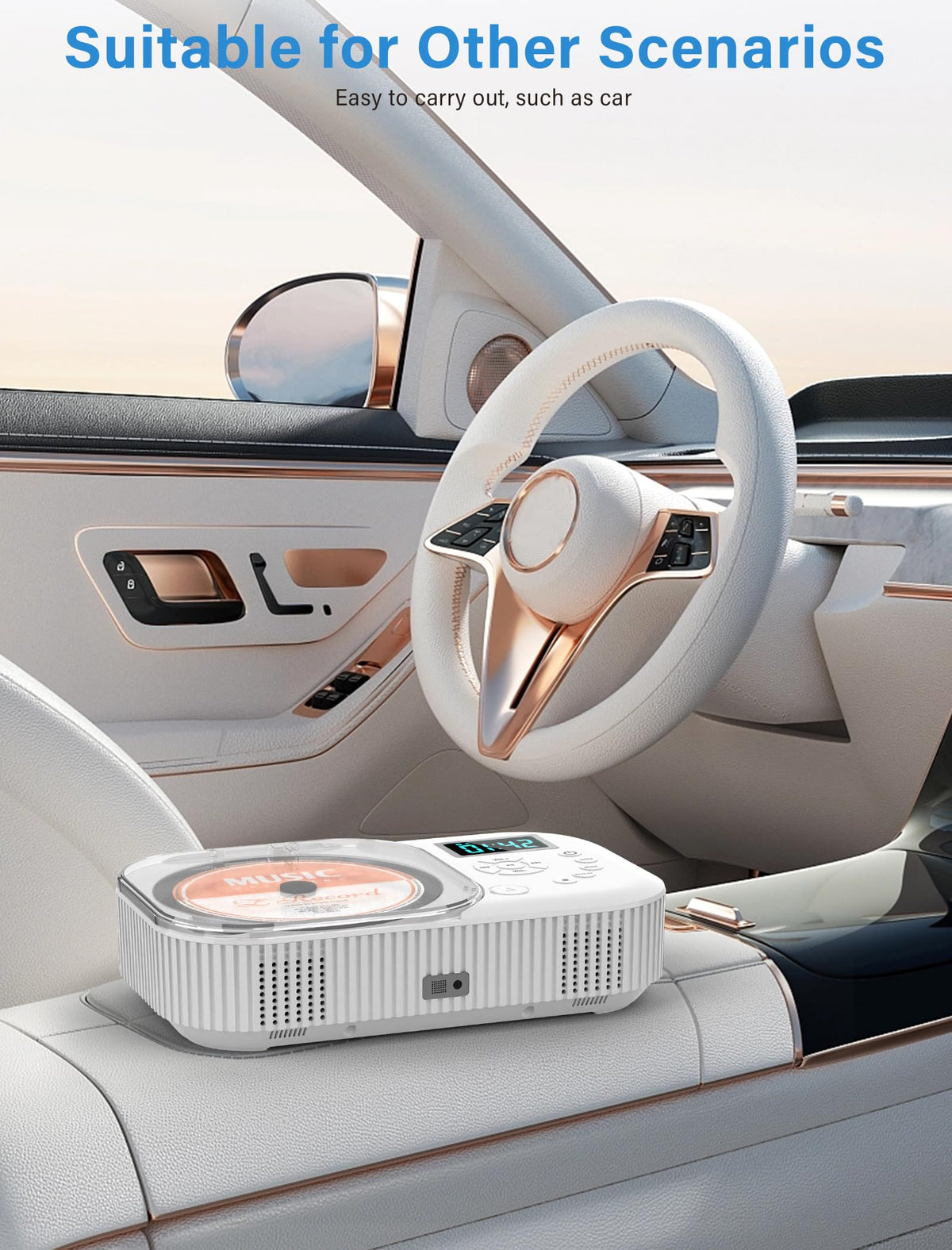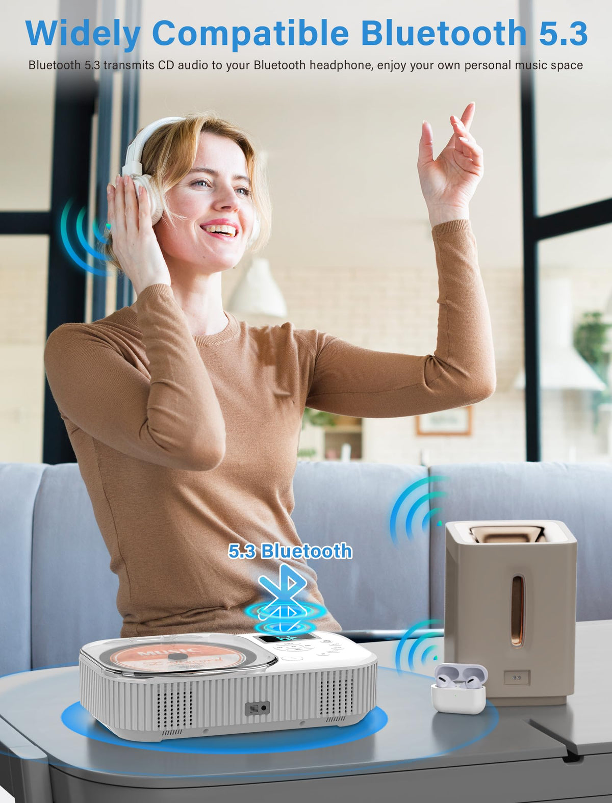 Q: Can I connect Bluetooth headphones or speakers to this CD player?A: Yes, the 2000mAh CD Player is equipped with Bluetooth 5.3, allowing you to connect Bluetooth headphones, earbuds, or speakers for a wireless listening experience.