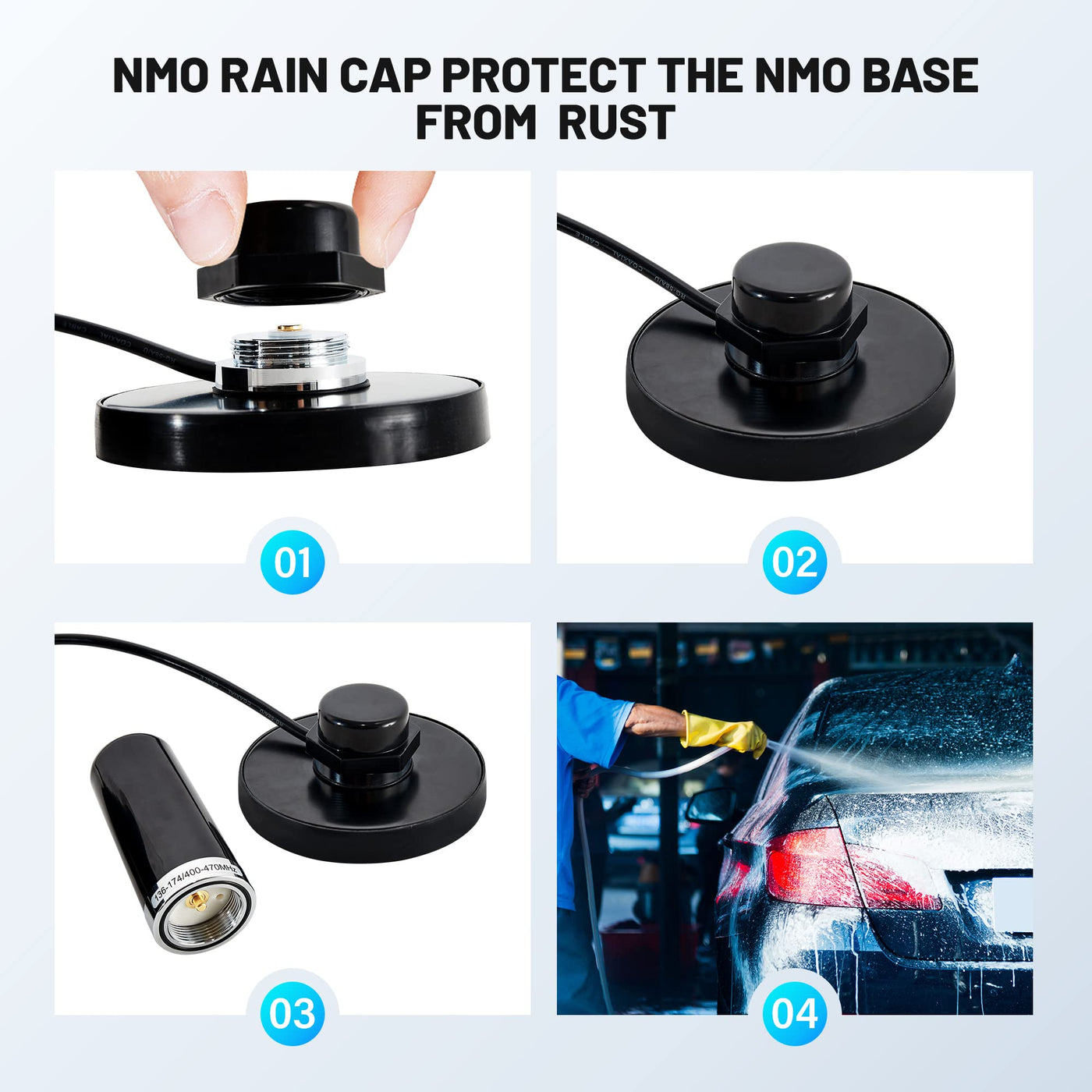 Q: How should I care for the NMO antenna and its components?A: To maintain your NMO antenna, ensure the base cap is used to protect the mount from water and debris. Regularly check connections and clean the magnetic base to ensure optimal performance.