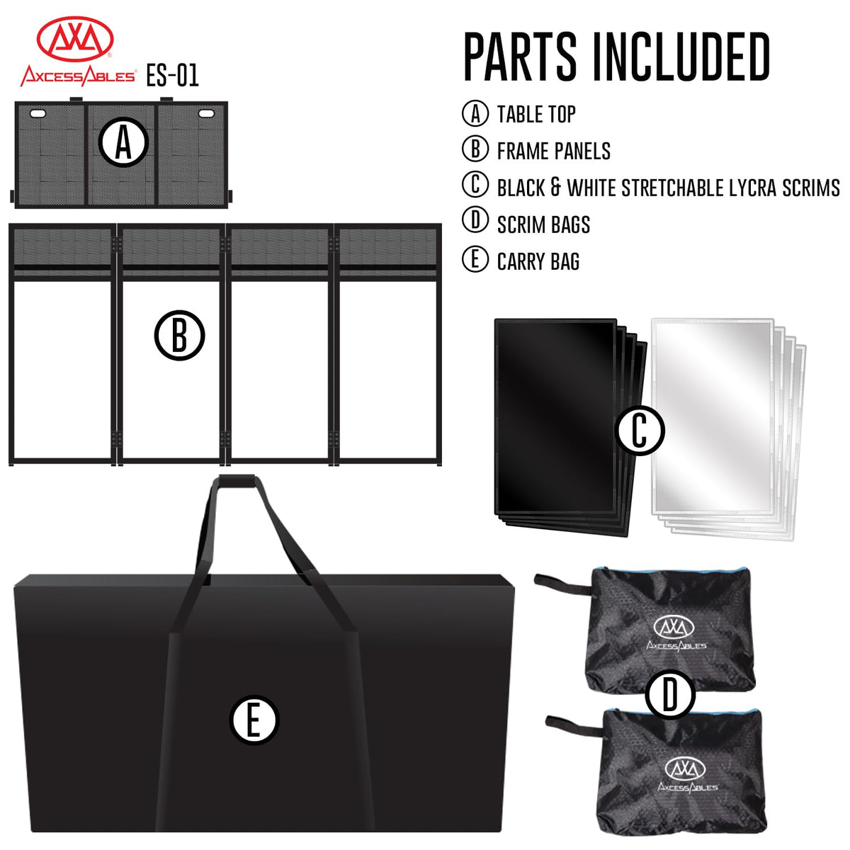 Axcessables Portable Dj Facade Booth With Black And White Lighting Scrims, Carry Cases | Standing Dj Table 40'' X 20'' | Dj Co